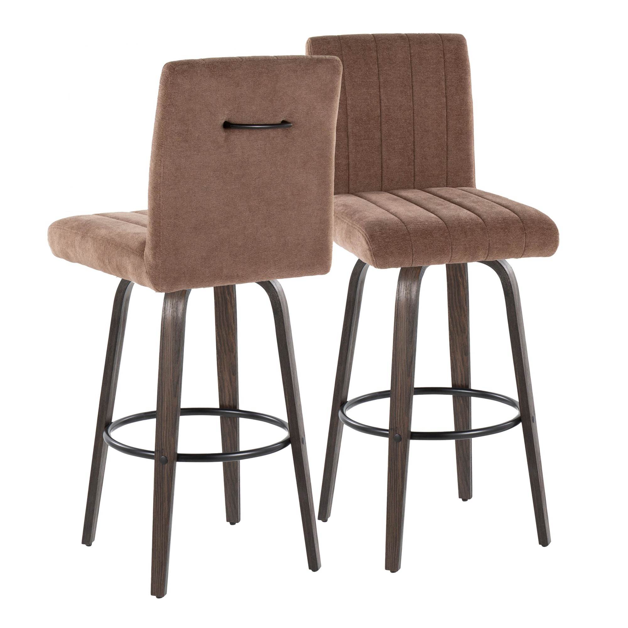 Introducing the Hank Fixed-Height Barstool by LumiSource, a modern masterpiece that combines style and comfort. Featuring a plush tufted cushioned seat with a decorative handle adorning the seat back and a sturdy wood frame, this swivel stool adds a touch of sophistication to any bar area. With its sleek tapered legs and 360-degree rotation, the Hank provides both form and function, making it the perfect seating solution for your home.