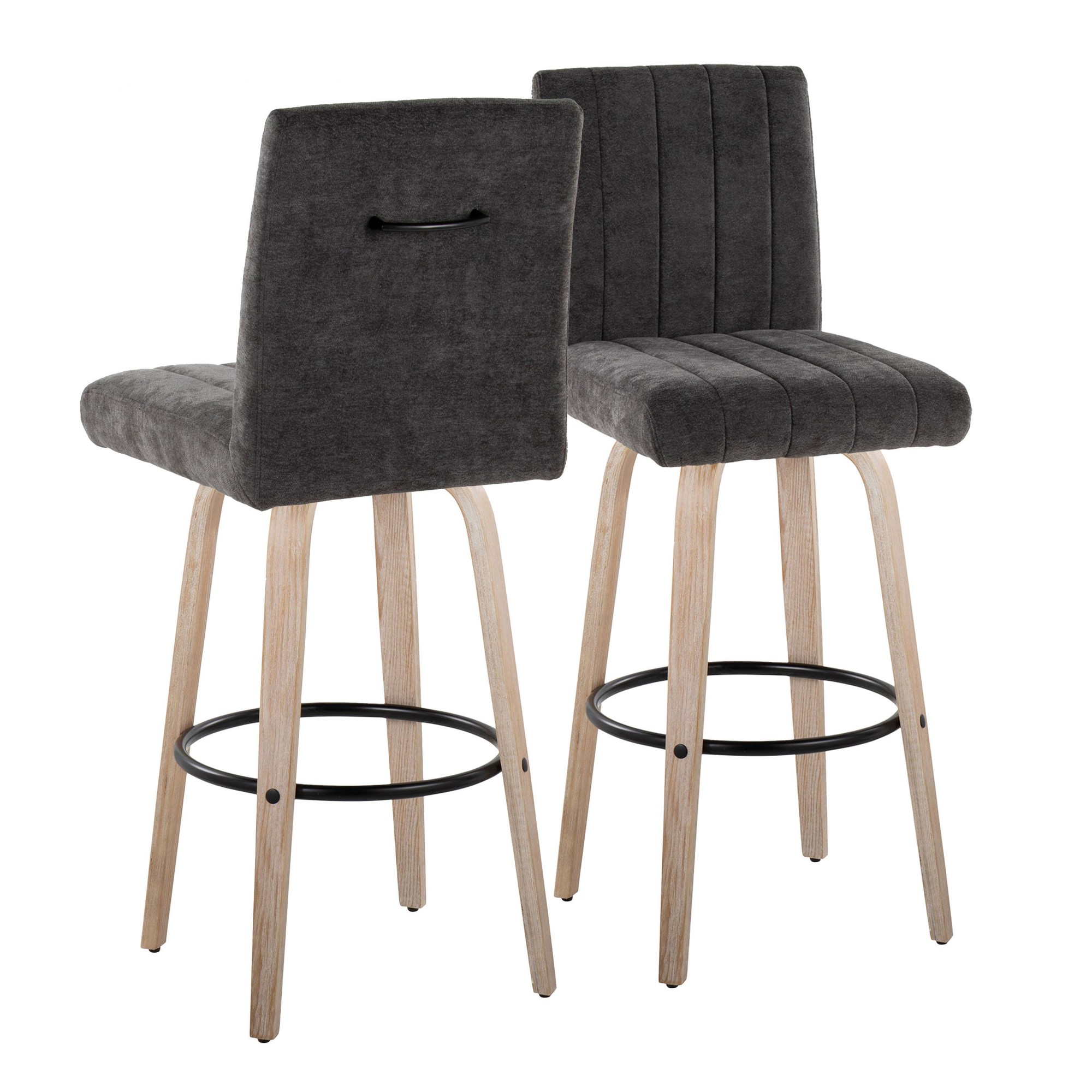 Introducing the Hank Fixed-Height Barstool by LumiSource, a modern masterpiece that combines style and comfort. Featuring a plush tufted cushioned seat with a decorative handle adorning the seat back and a sturdy wood frame, this swivel stool adds a touch of sophistication to any bar area. With its sleek tapered legs and 360-degree rotation, the Hank provides both form and function, making it the perfect seating solution for your home.
