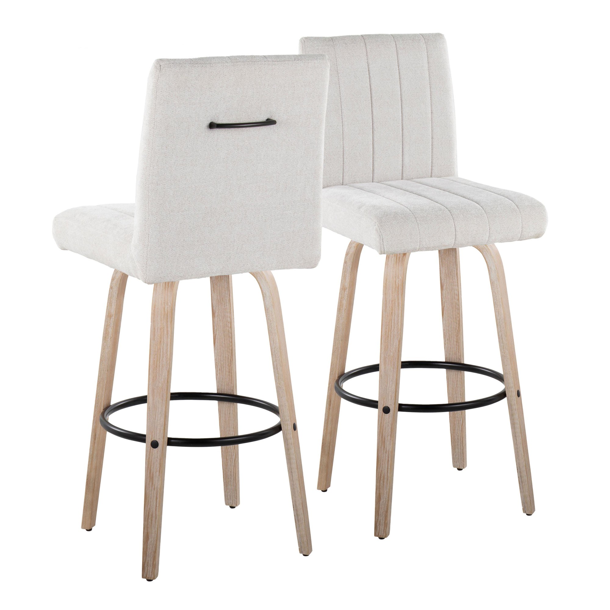 Introducing the Hank Fixed-Height Barstool by LumiSource, a modern masterpiece that combines style and comfort. Featuring a plush tufted cushioned seat with a decorative handle adorning the seat back and a sturdy wood frame, this swivel stool adds a touch of sophistication to any bar area. With its sleek tapered legs and 360-degree rotation, the Hank provides both form and function, making it the perfect seating solution for your home.