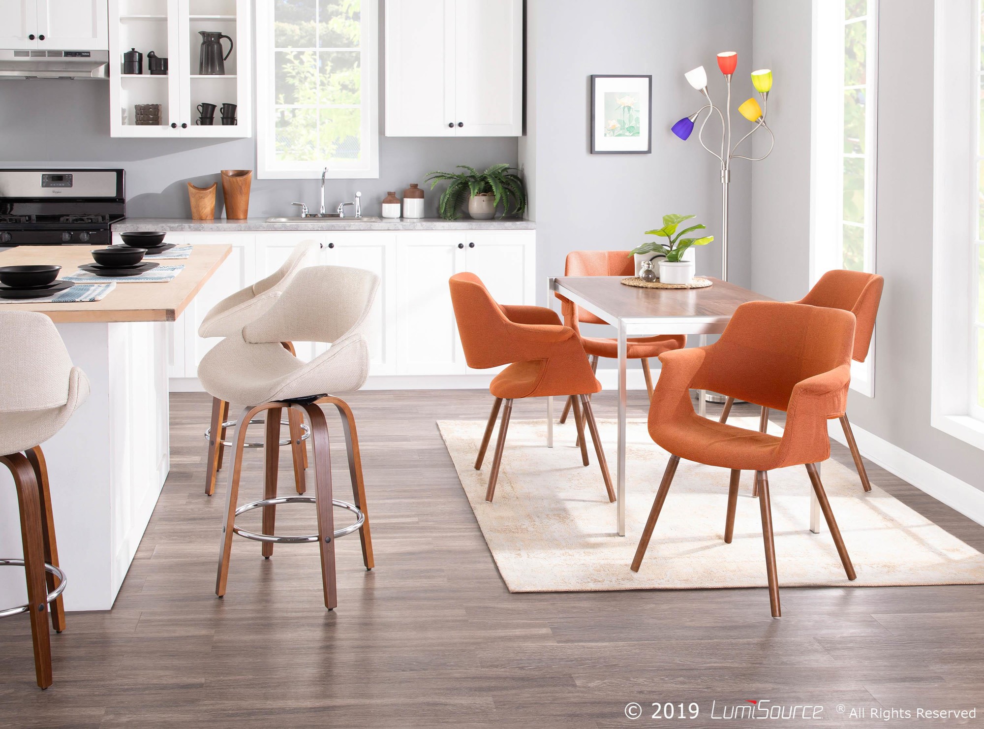 The Medusa® lamp’s popularity is unsurpassed! This versatile lamp provides a bold color statement in any room and adapts to your need for function paired with style. 24 inch goose-neck arms allow you to direct light where you need it. A brushed metal finish on the base and frame catches the reflection of interchangeable colored glass sconces with interior opal flashing. Takes 25-watt candelabra bulbs.