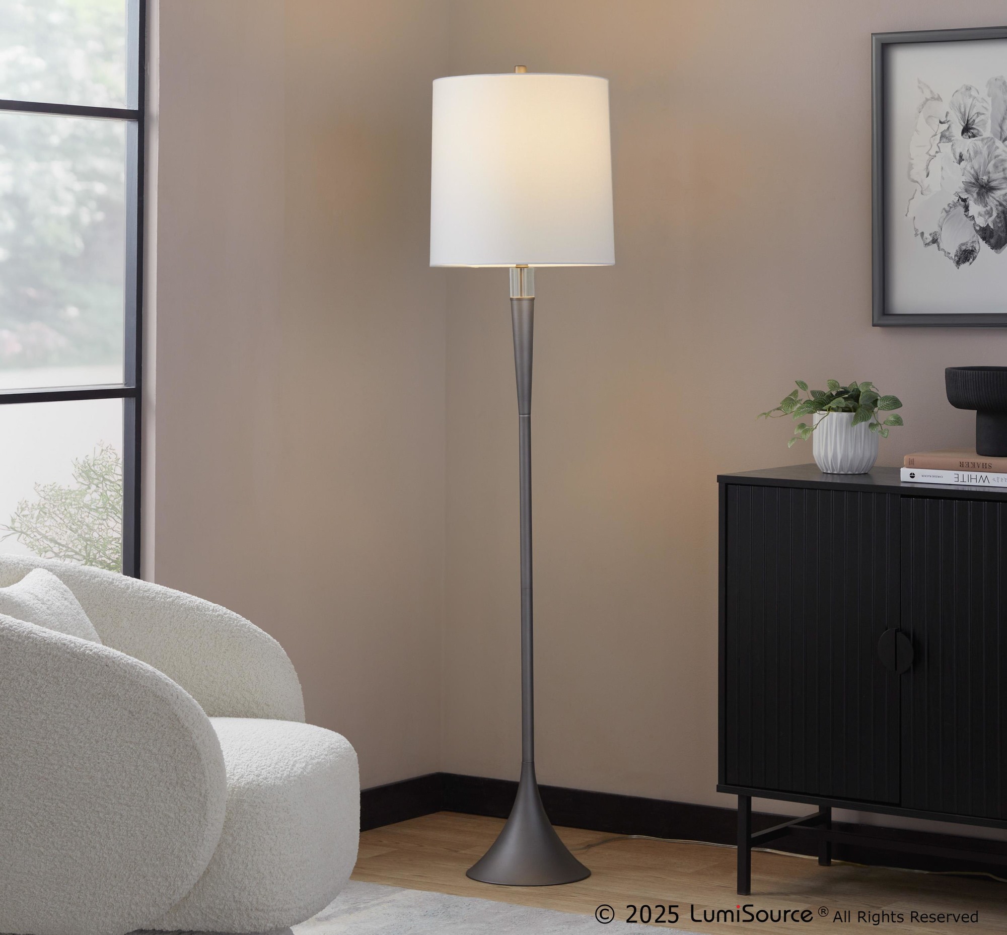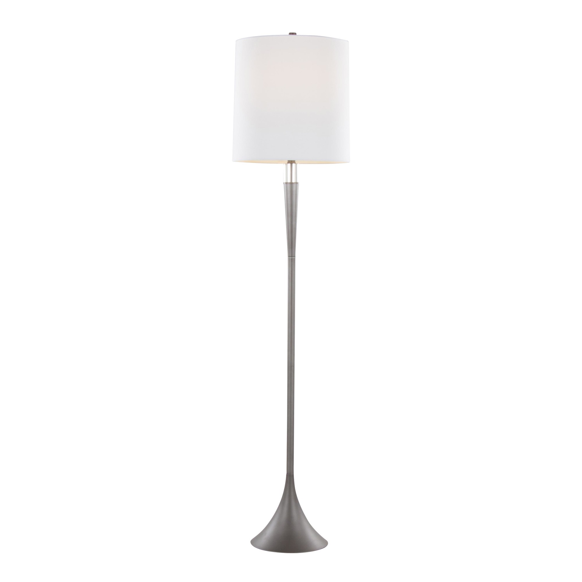 Add sleek contemporary style to your space with the Marla Floor Lamp by LumiSource, which features a beautiful round base and elegant crystal accent. This lamp is topped by a metal finial and a drum shade, creating a lamp that is versatile yet stylish. This lamp is a chic addition to any aesthetic with its modern and simplistic features.