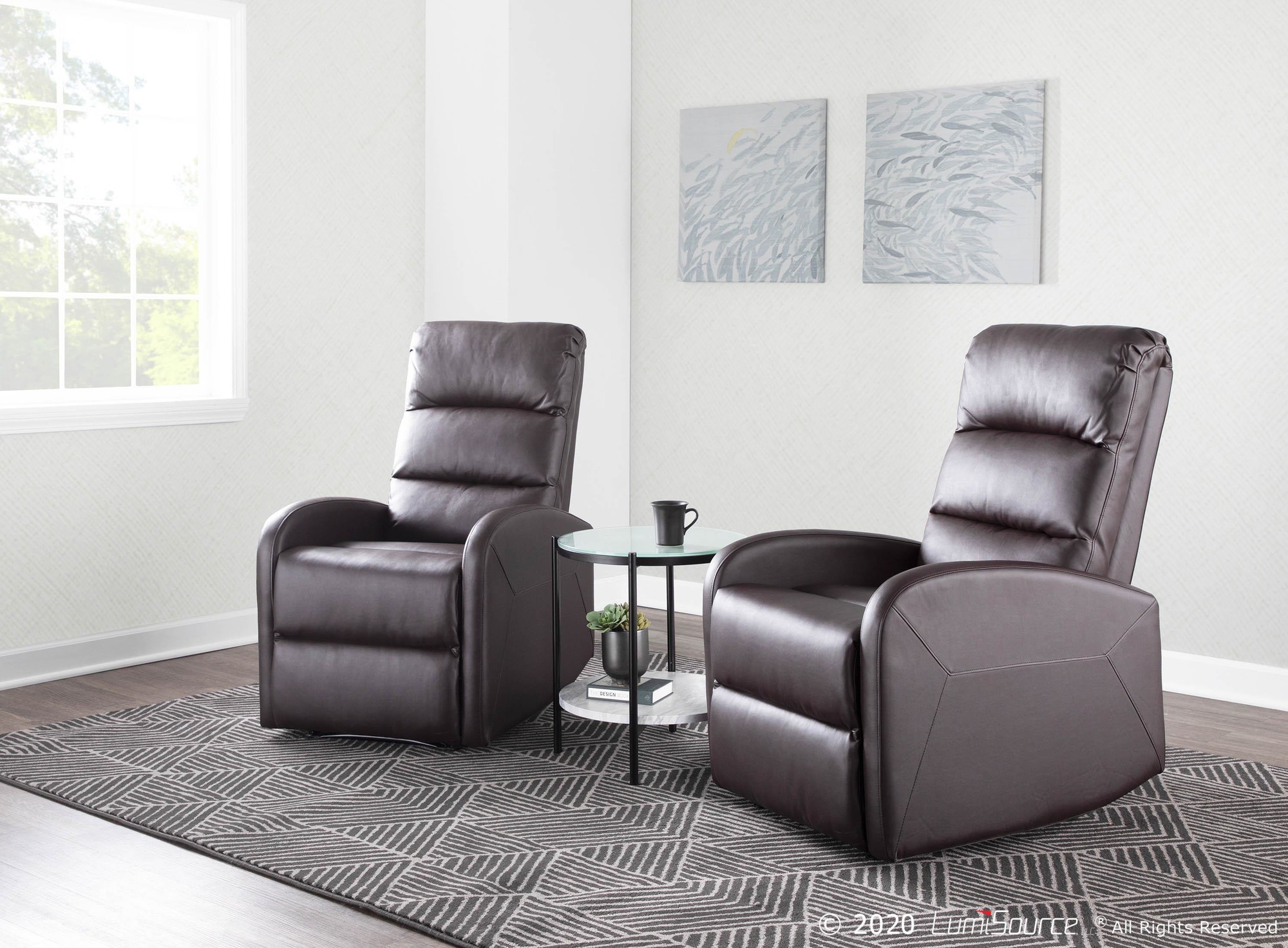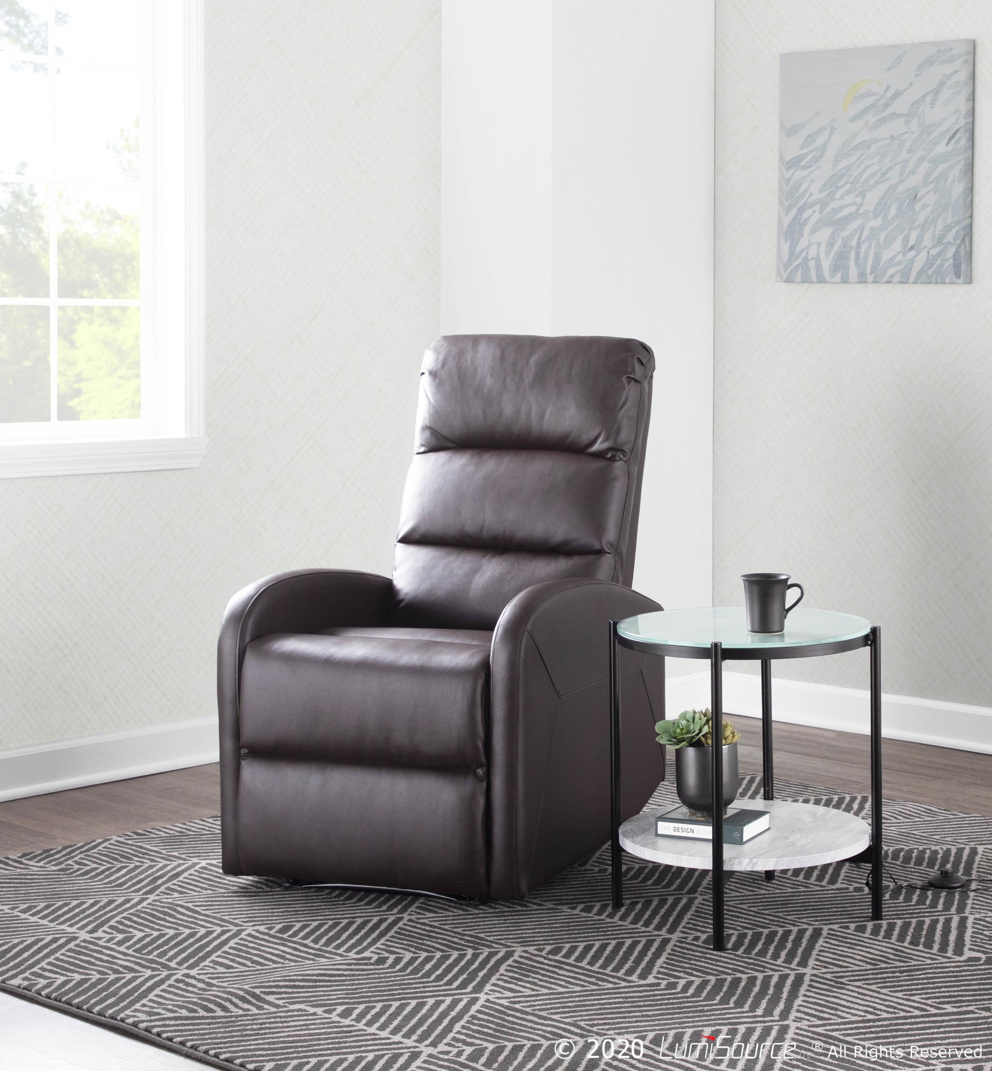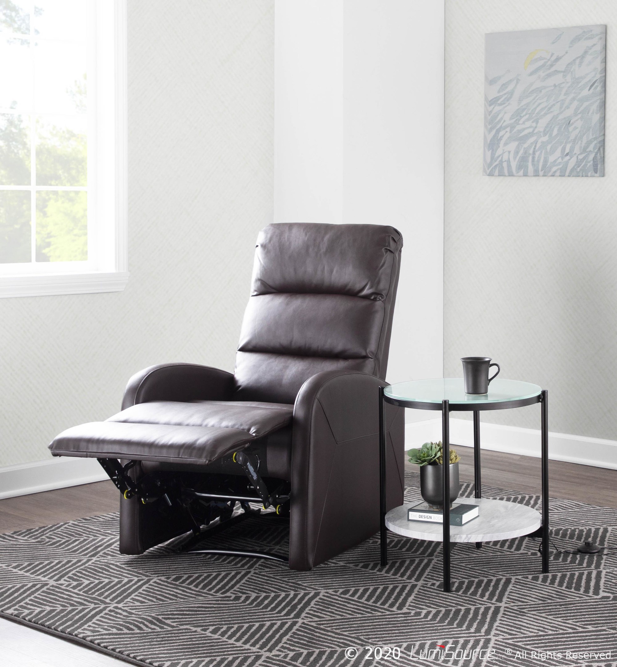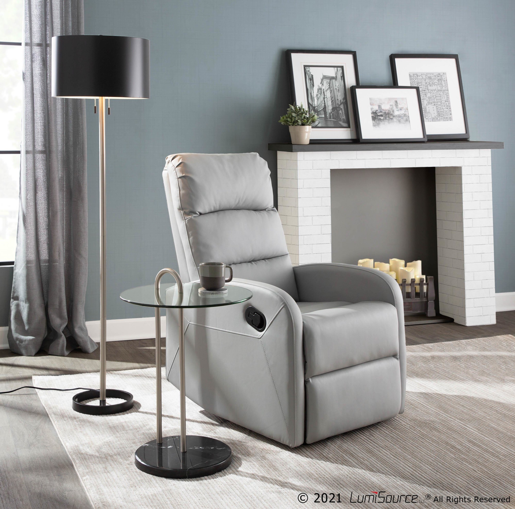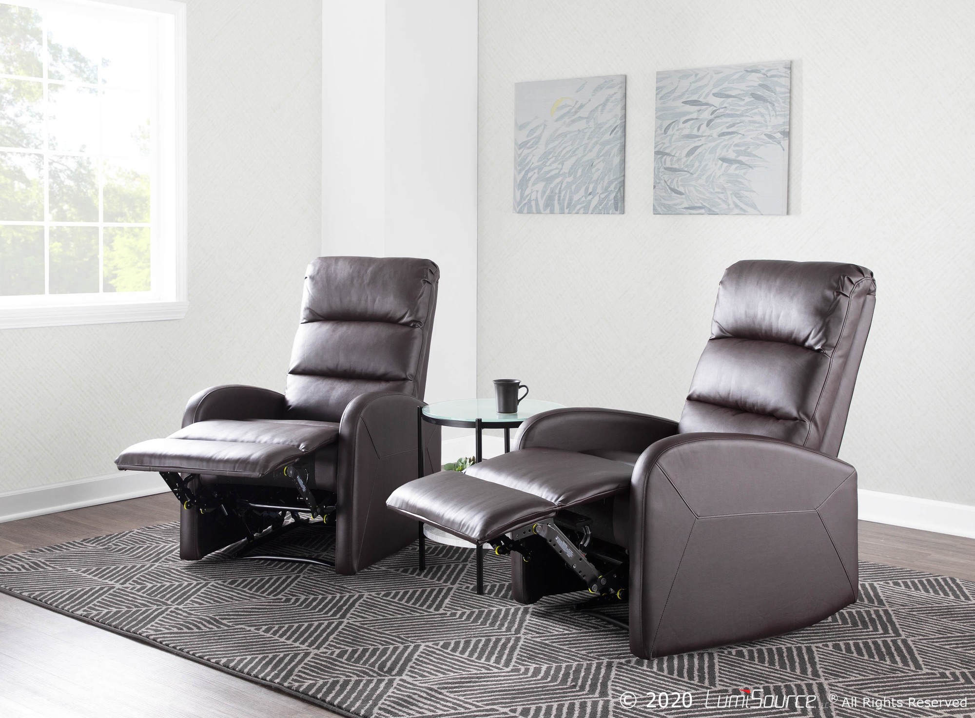 The Dormi Recliner by LumiSource adds style and comfort to any living space with a contemporary silhouette and faux leather upholstery. This comfortable recliner includes foam padding, a tufted seat and backrest, and an easy manual recline. Available in a variety of upholstery colors, choose the one that fits your space the best.