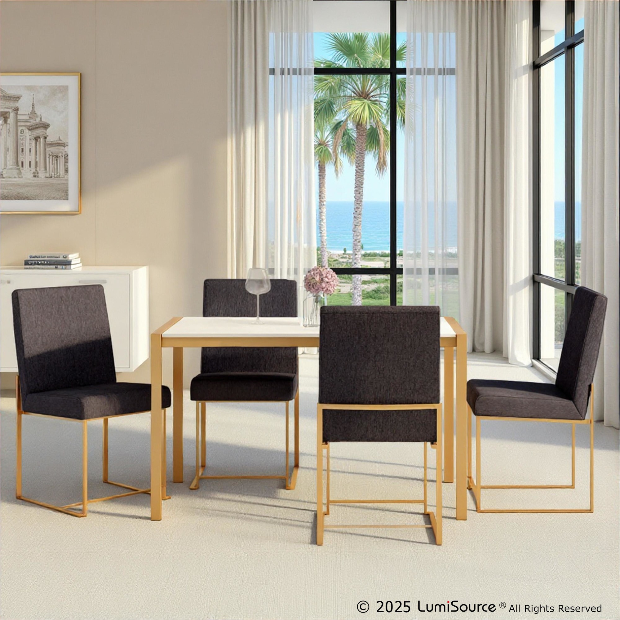 Modern elegance at its finest, the Fuji High Back Dining Chair by LumiSource features an extra-wide (and extra comfortable) upholstered seat, high padded backrest, and stylish metal frame. The perfect dining chair, the Fuji is multi-functional and can be used as extra seating in a sitting room or as a stylish office chair. Available in stainless steel, gold, or black metal frame and a variety of sleek upholstery colors.