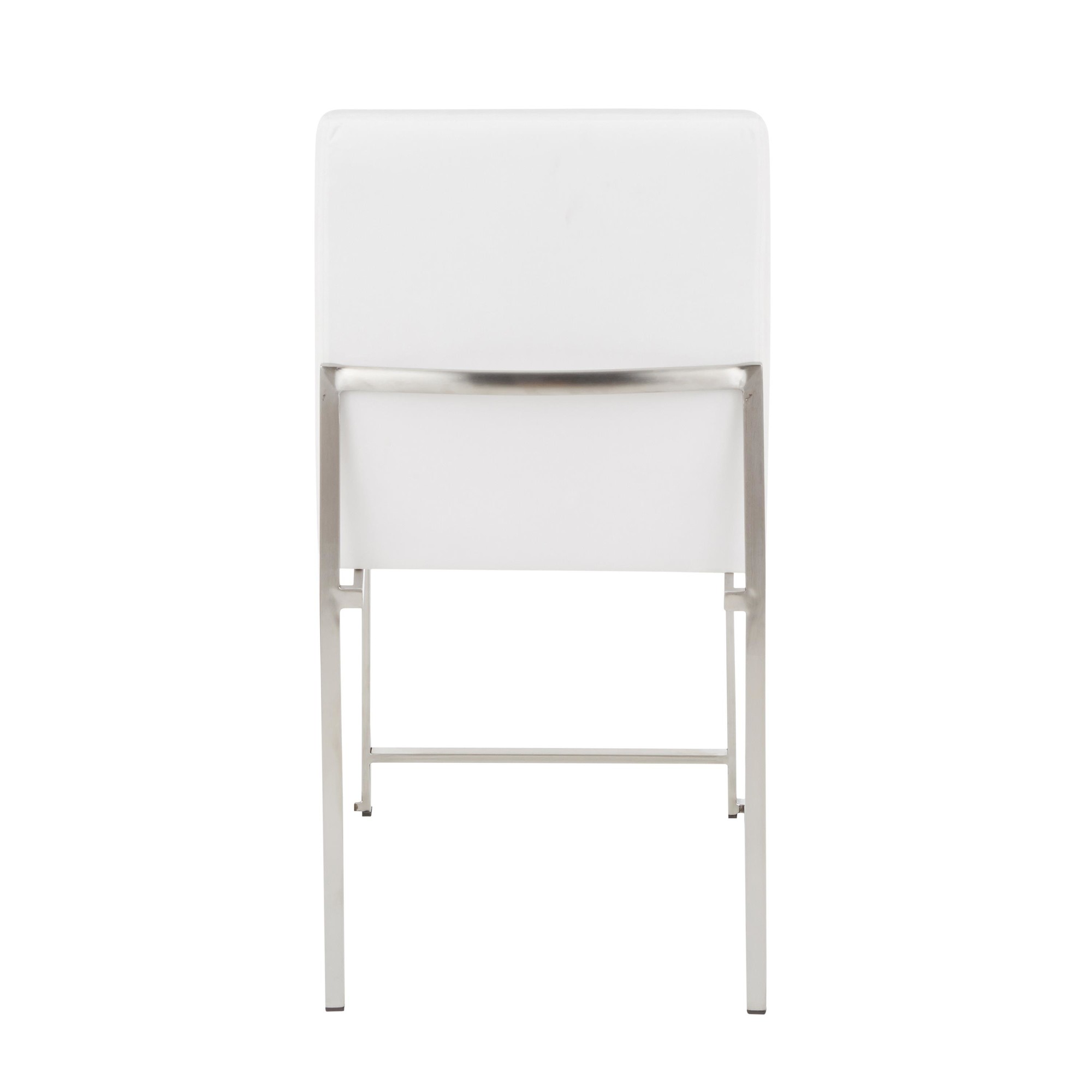 Modern elegance at its finest, the Fuji High Back Dining Chair features an extra-wide (and extra comfortable) upholstered seat, high padded backrest, and stylish metal frame. The perfect dining chair, the Fuji is multi-functional and can be used as extra seating in a sitting room or as a stylish office chair. Available in stainless steel or gold metal frame and a variety of sleek upholstery colors. Pair with the Fuji Dinette Table for a complete look.