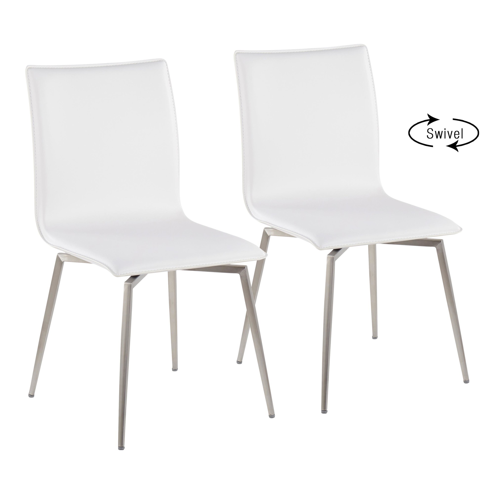Elegant and modern, the LumiSource Mason Upholstered Chair has a simple design with gorgeous elements. Featuring faux leather upholstery and a swiveling stainless steel base, the Mason Upholstered Chair is perfect for a dining area or an office. Sold in sets of two, pick the color that suits your space the best!