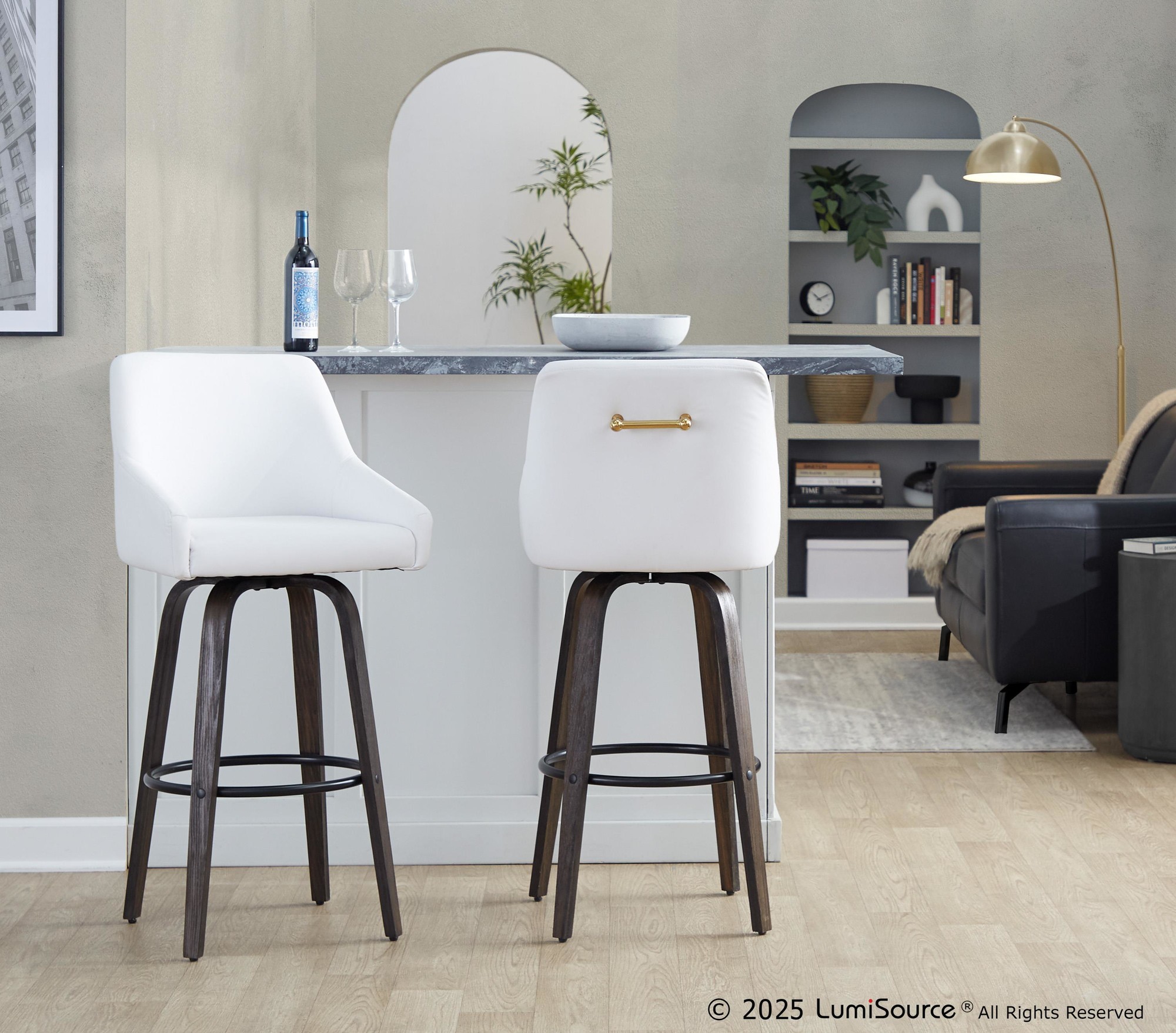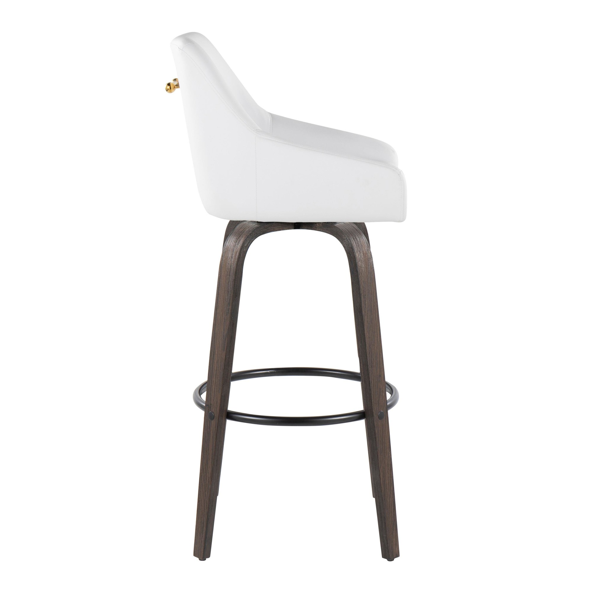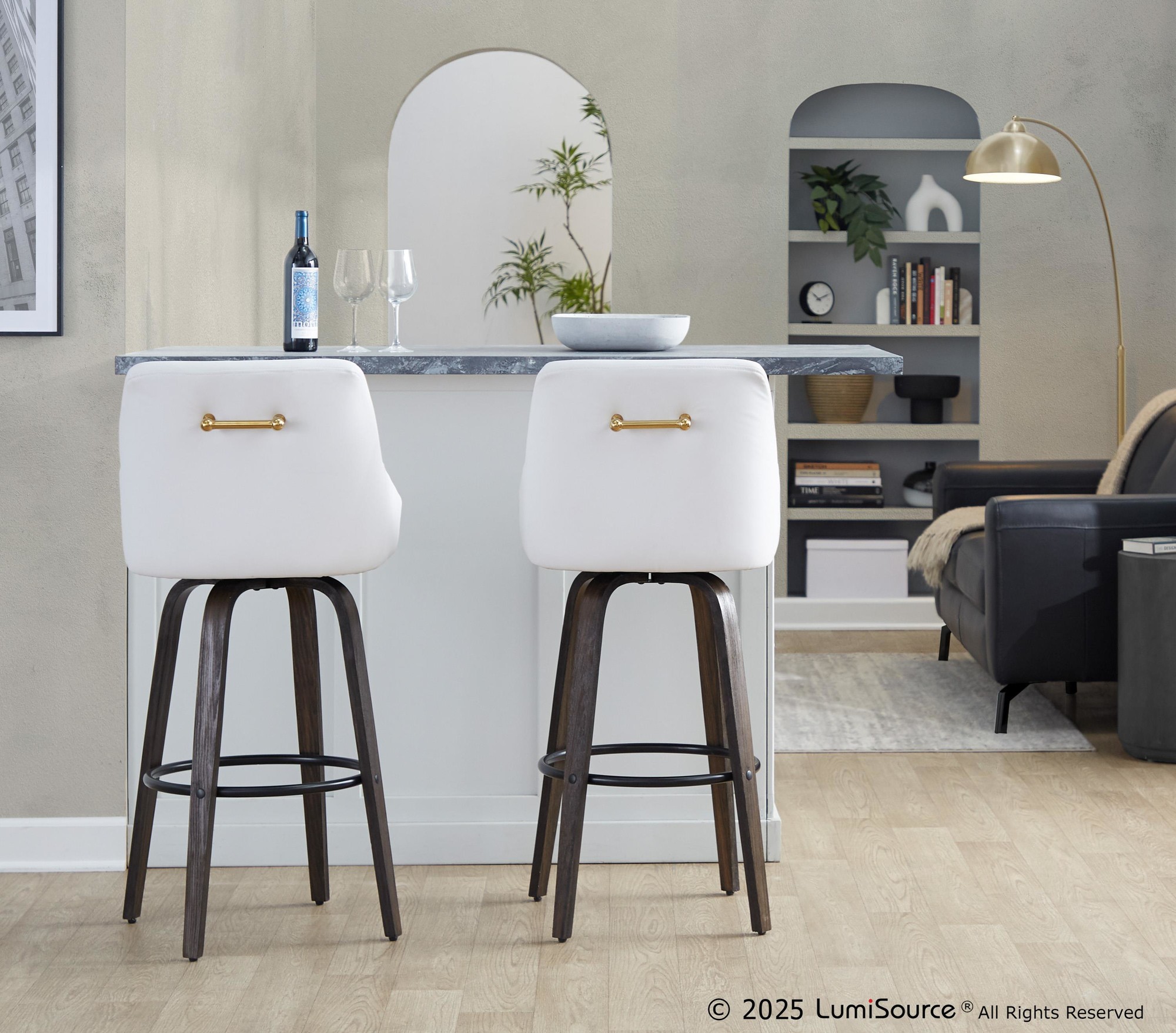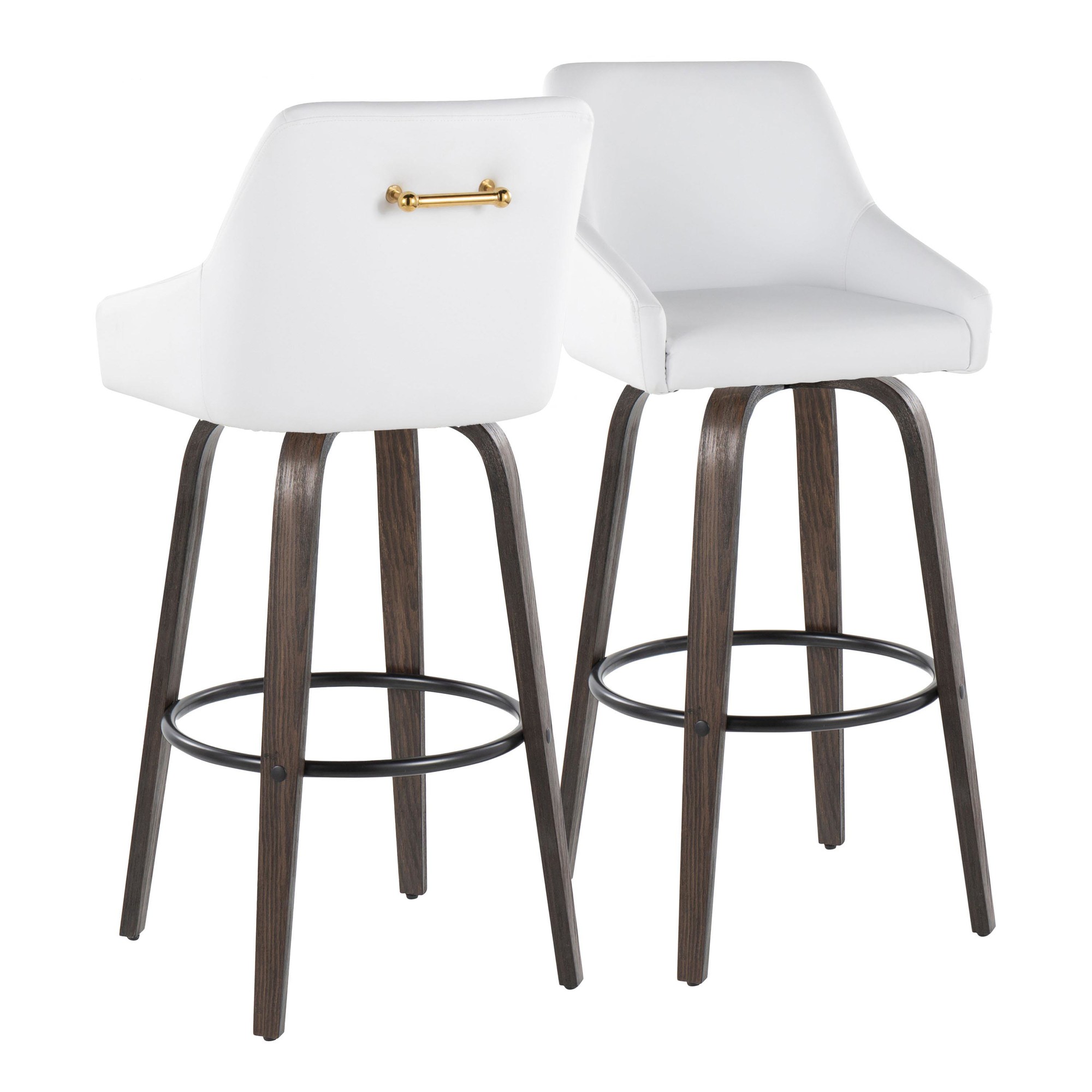 Elegant and simple, the LumiSource Hannah Fixed-Height Barstool will furnish any eating area in style. Featuring sleek bent wood legs, a comfortable padded upholstered seat, and a decorative handle adorning the seat back, the Hannah will elevate any space with its satisfying transitional design. Available in a variety of upholstery colors and finishes, choose the one that fits your space best.