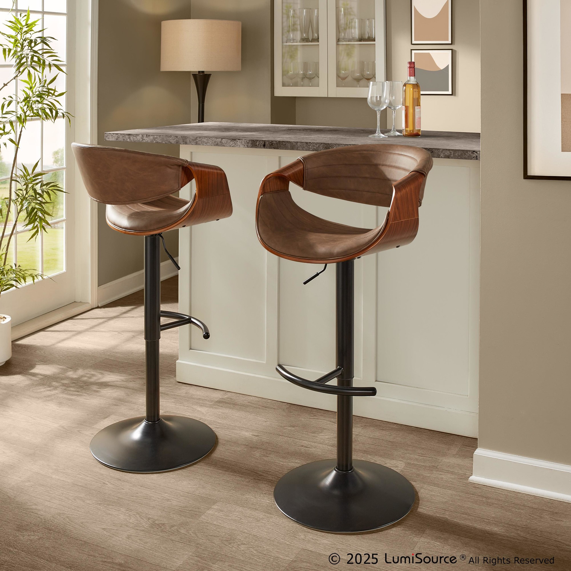 A curvaceous dose of Mid-Century style, the unique design and silhouette of the Symphony Adjustable Barstool by LumiSource will look great at your bar or counter. Upholstered in a sleek faux leather accented with vertical tufting and bent wood armrests, the Symphony comes in a variety of colors to fit in any room.