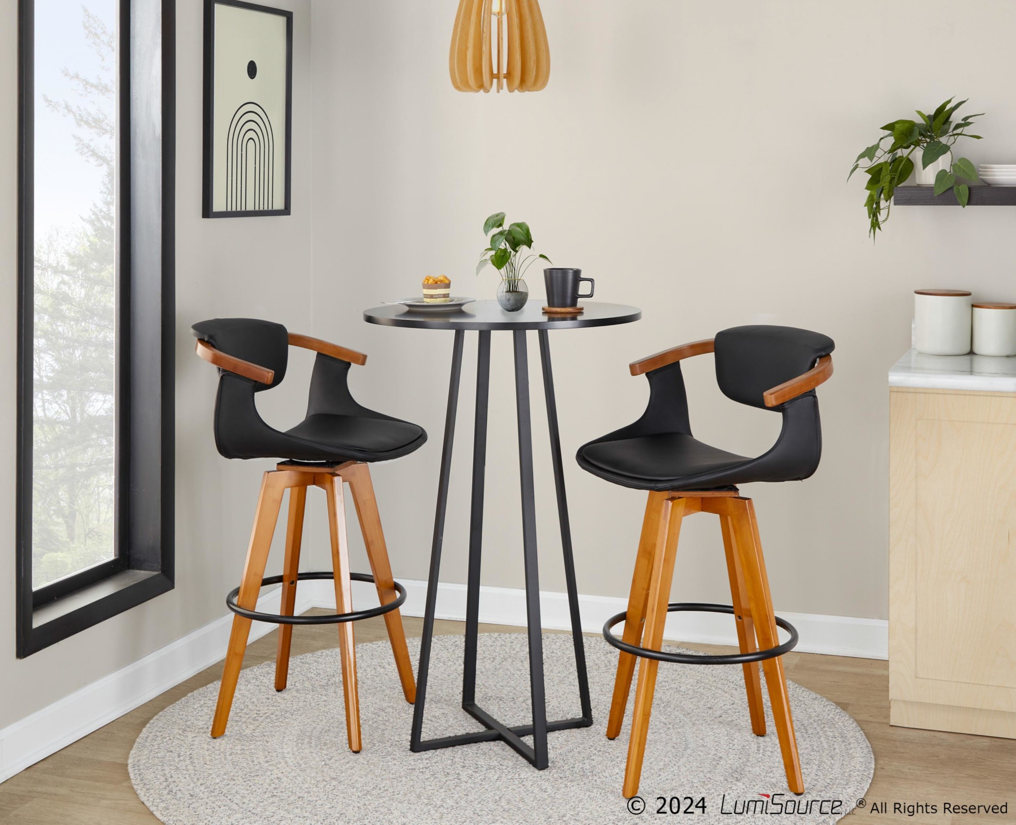| The Mid-Century charm of the Oracle Fixed-Height Bar Stool by LumiSource combines sturdy construction with aesthetic appeal. A walnut wood pressed grain bamboo frame is accented by faux leather upholstery and stylish tapered legs. Available in a variety of color combinations, choose the one that fits your space best. |
