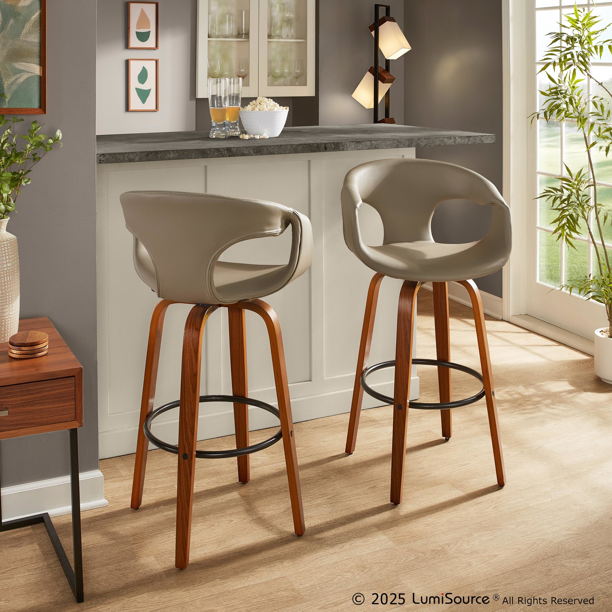 Introducing the Curva Fixed-Height Barstool by LumiSource, where modern design meets unparalleled comfort. With its stylish, fully-upholstered seat and elegant bent wood legs, this stool adds a touch of sophistication to any space. The unique cut-out armrests and cushioned seat ensure that style doesn't compromise comfort. Elevate your kitchen or bar area with the perfect blend of form and function!