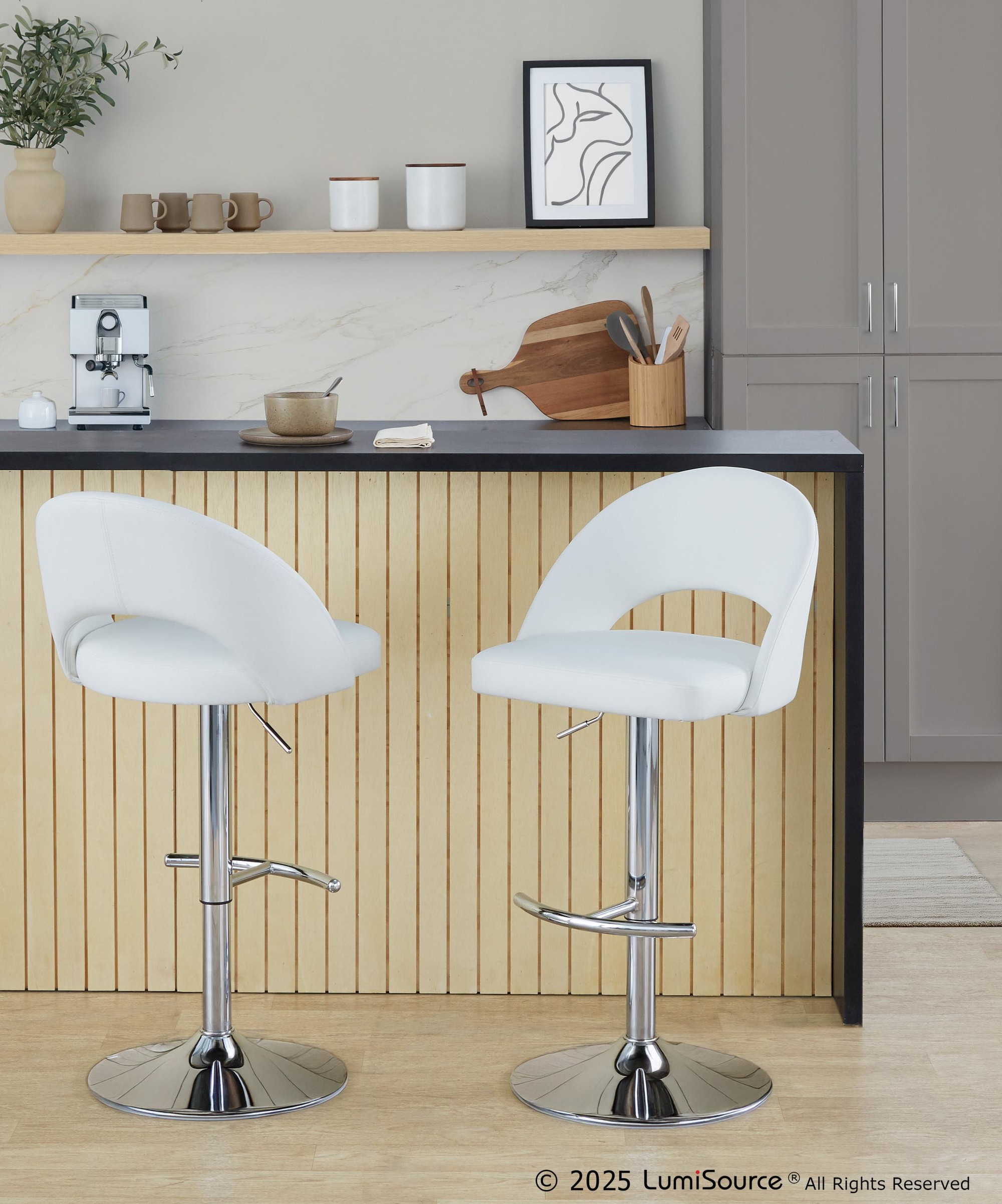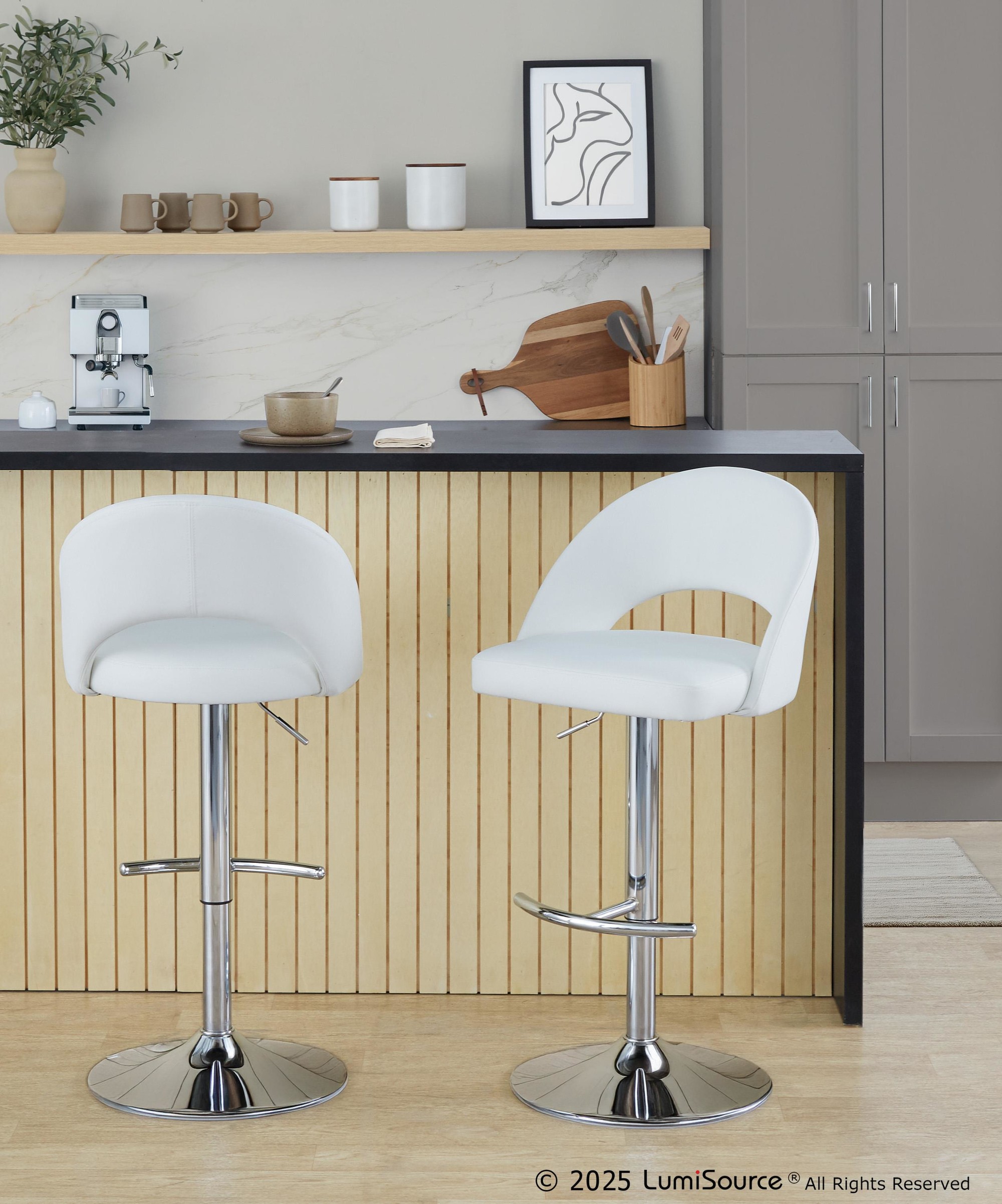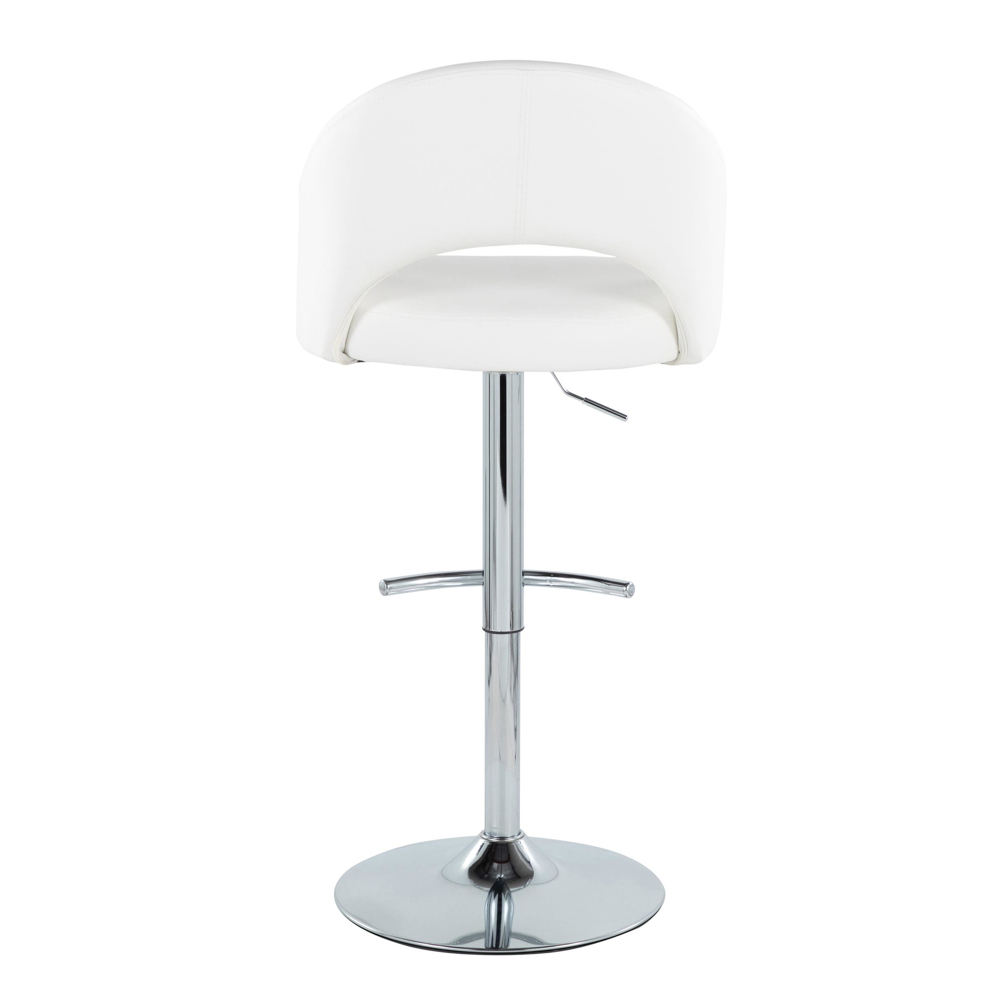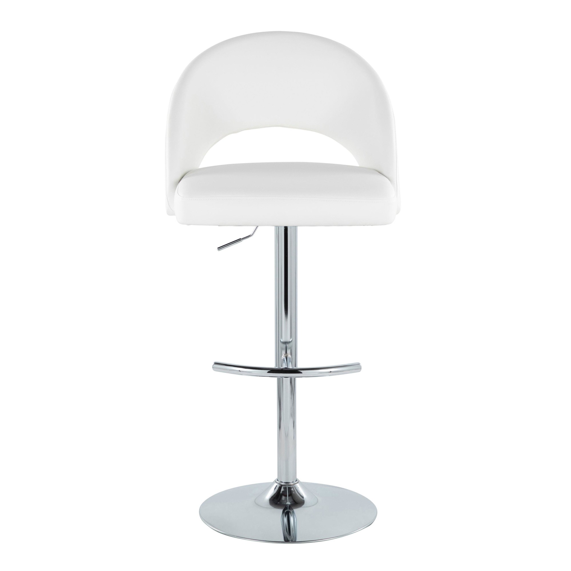 Introducing the Renee Adjustable Barstool by LumiSource where modern style meets unparalleled comfort. With a low rounded backrest, comfortable upholstery, and metal base with a rounded footrest, it's the perfect piece for your contemporary dining or bar area. The Renee is available in a variety of upholstery options and colors, so select one that suits your space the best!