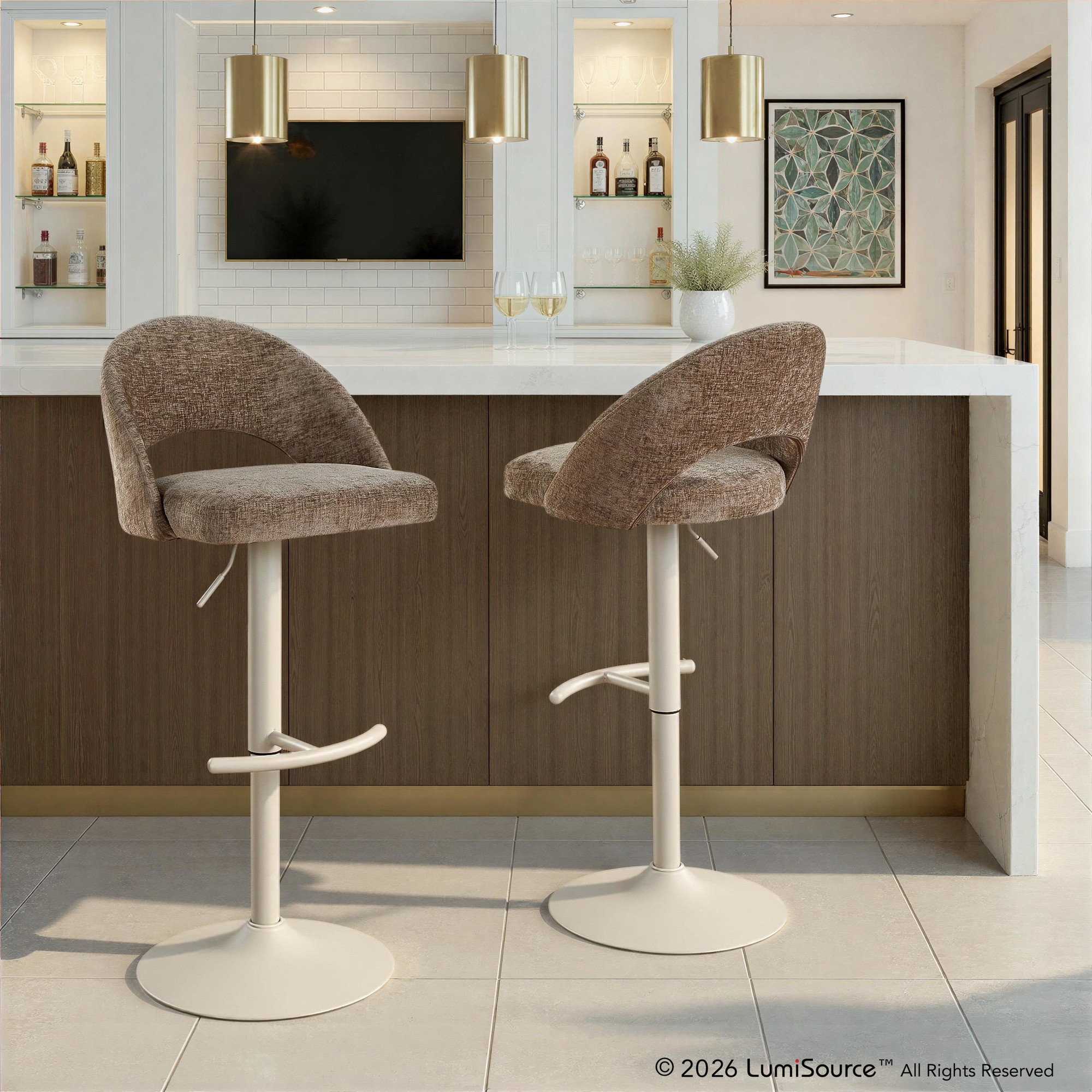 Introducing the Renee Adjustable Barstool by LumiSource where modern style meets unparalleled comfort. With a low rounded backrest, comfortable upholstery, and metal base with a rounded footrest, it's the perfect piece for your contemporary dining or bar area. The Renee is available in a variety of upholstery options and colors, so select one that suits your space the best!