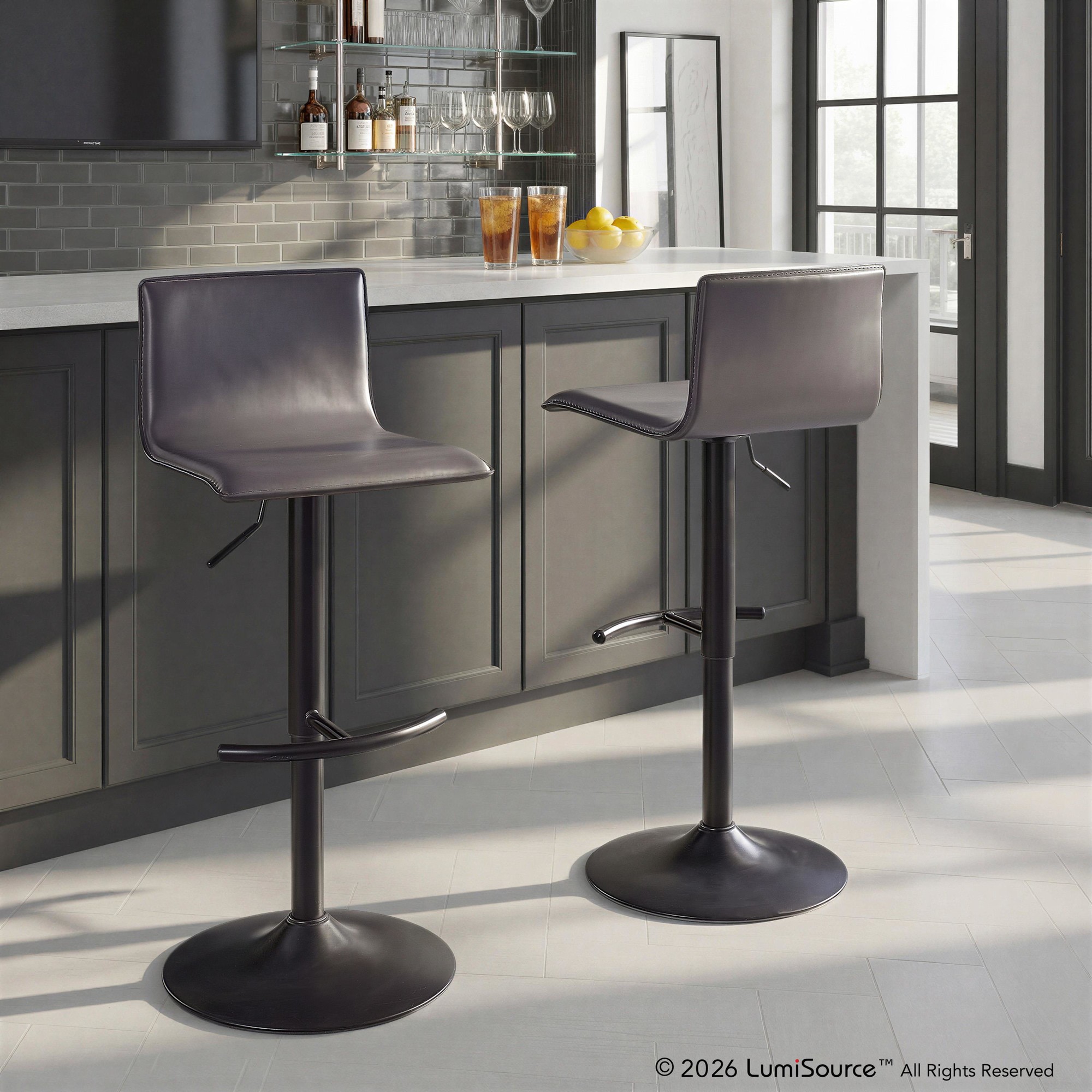 Elegant and modern, the LumiSource Mara Adjustable Barstool has a simple design with gorgeous elements. Featuring faux leather upholstery and a metal base with a round t footrest, the Mara Adjustable Barstool is perfect for your kitchen or dining area. Sold in sets of two, pick the color that suits your space the best!