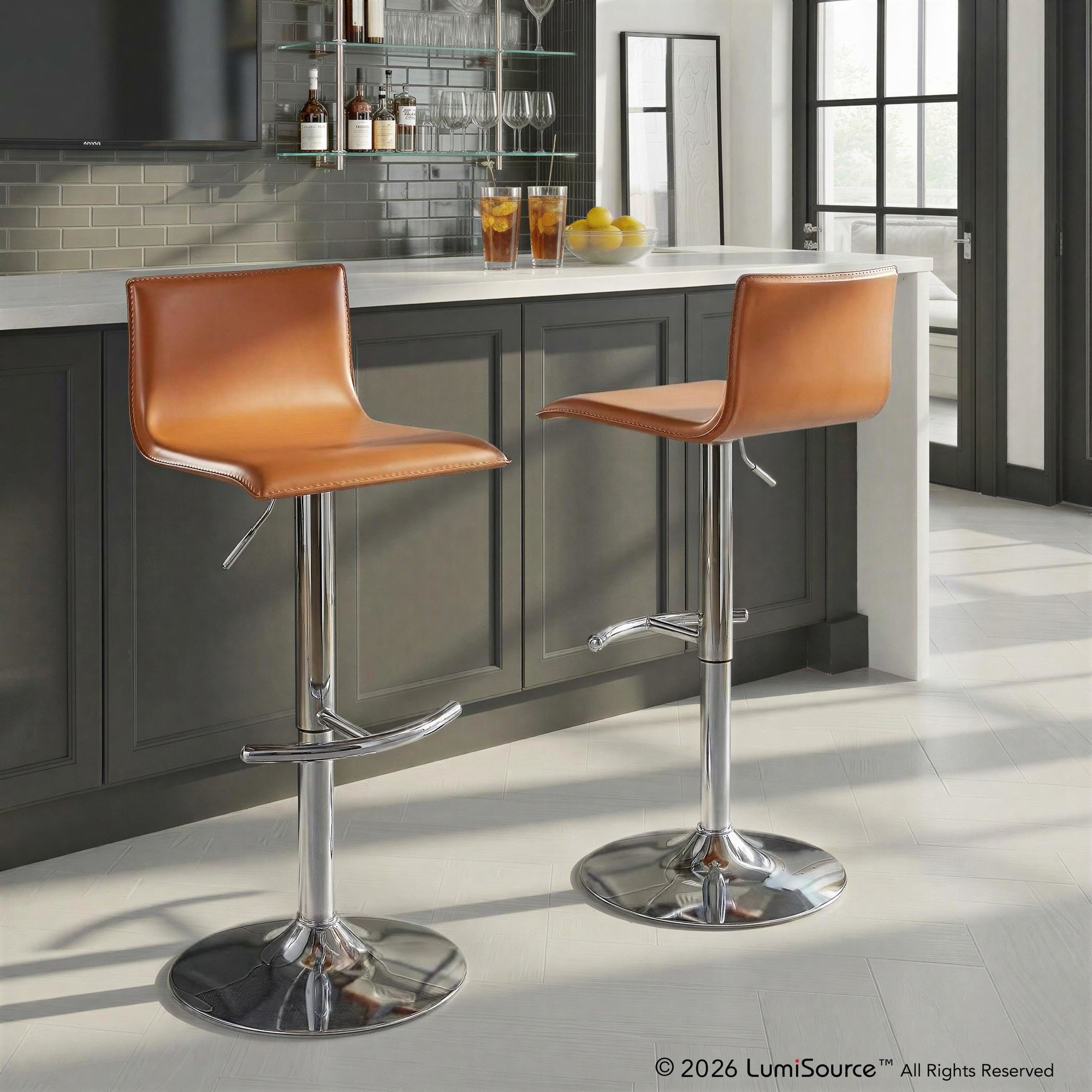 Elegant and modern, the LumiSource Mara Adjustable Barstool has a simple design with gorgeous elements. Featuring faux leather upholstery and a metal base with a round t footrest, the Mara Adjustable Barstool is perfect for your kitchen or dining area. Sold in sets of two, pick the color that suits your space the best!