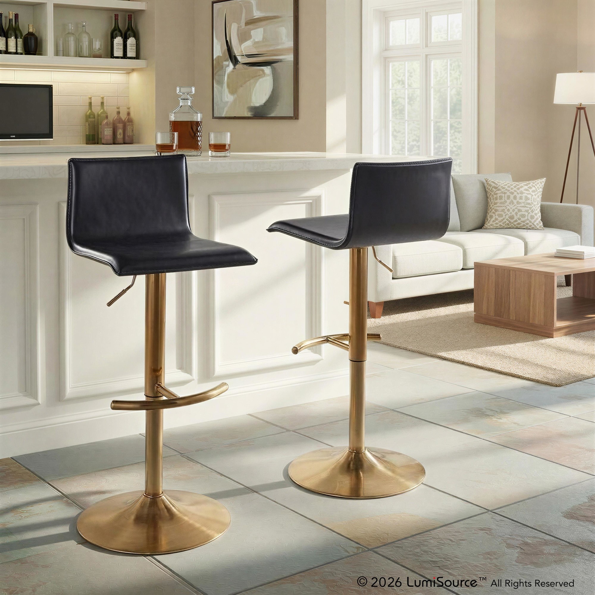 Elegant and modern, the LumiSource Mara Adjustable Barstool has a simple design with gorgeous elements. Featuring faux leather upholstery and a metal base with a round t footrest, the Mara Adjustable Barstool is perfect for your kitchen or dining area. Sold in sets of two, pick the color that suits your space the best!