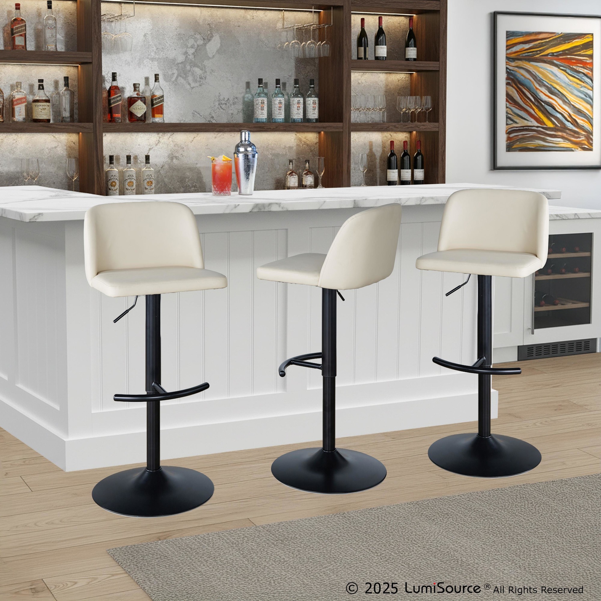 Comfort, modern simplicity, and classic lines define the appealing look of the Toriano Adjustable Bar Stool by LumiSource. A padded upholstered seat sits on an adjustable contemporary inspired pedestal base with a built-in footrest. Available in various colors, choose the one that suits your space best!