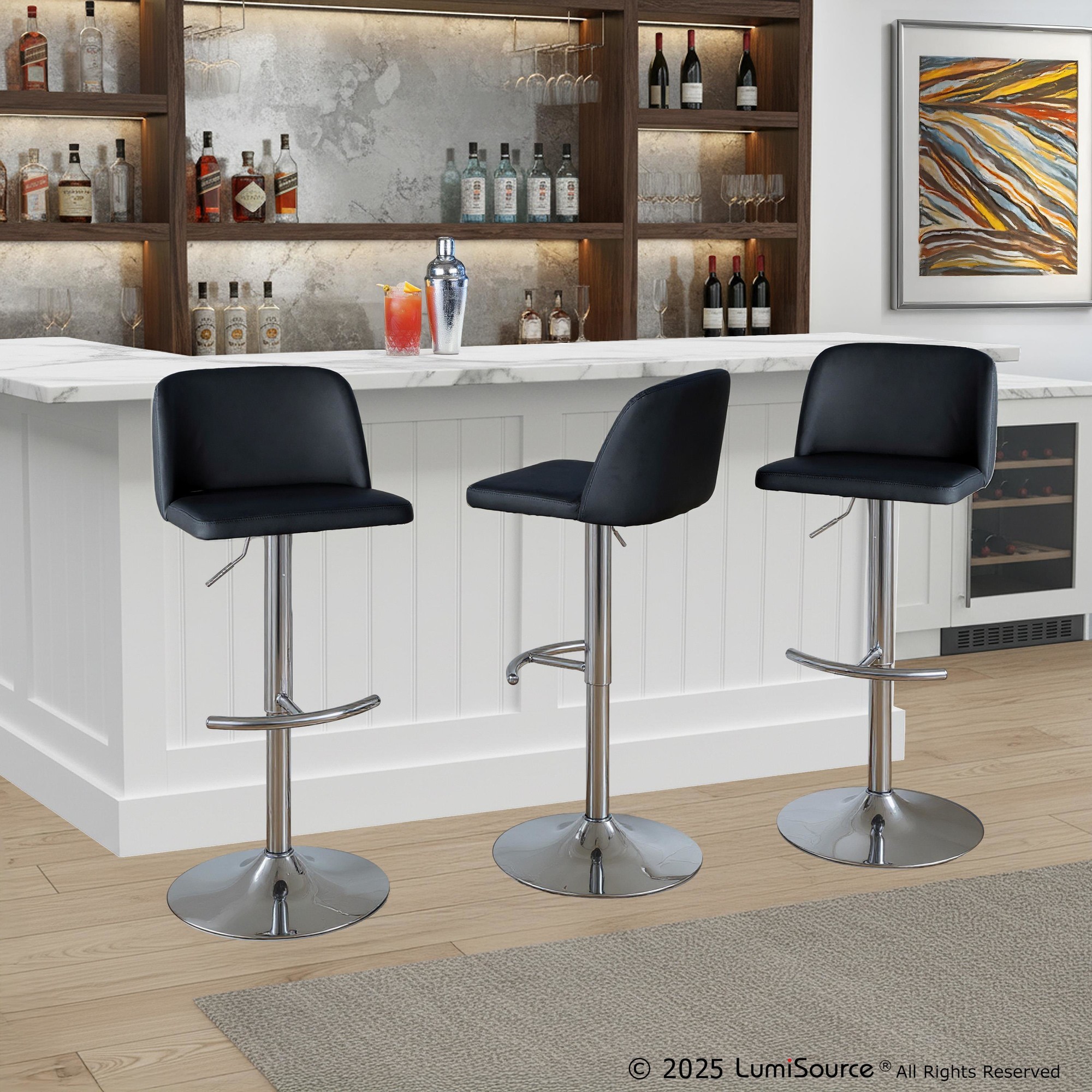 Comfort, modern simplicity, and classic lines define the appealing look of the Toriano Adjustable Bar Stool by LumiSource. A padded upholstered seat sits on an adjustable contemporary inspired pedestal base with a built-in footrest. Available in various colors, choose the one that suits your space best!