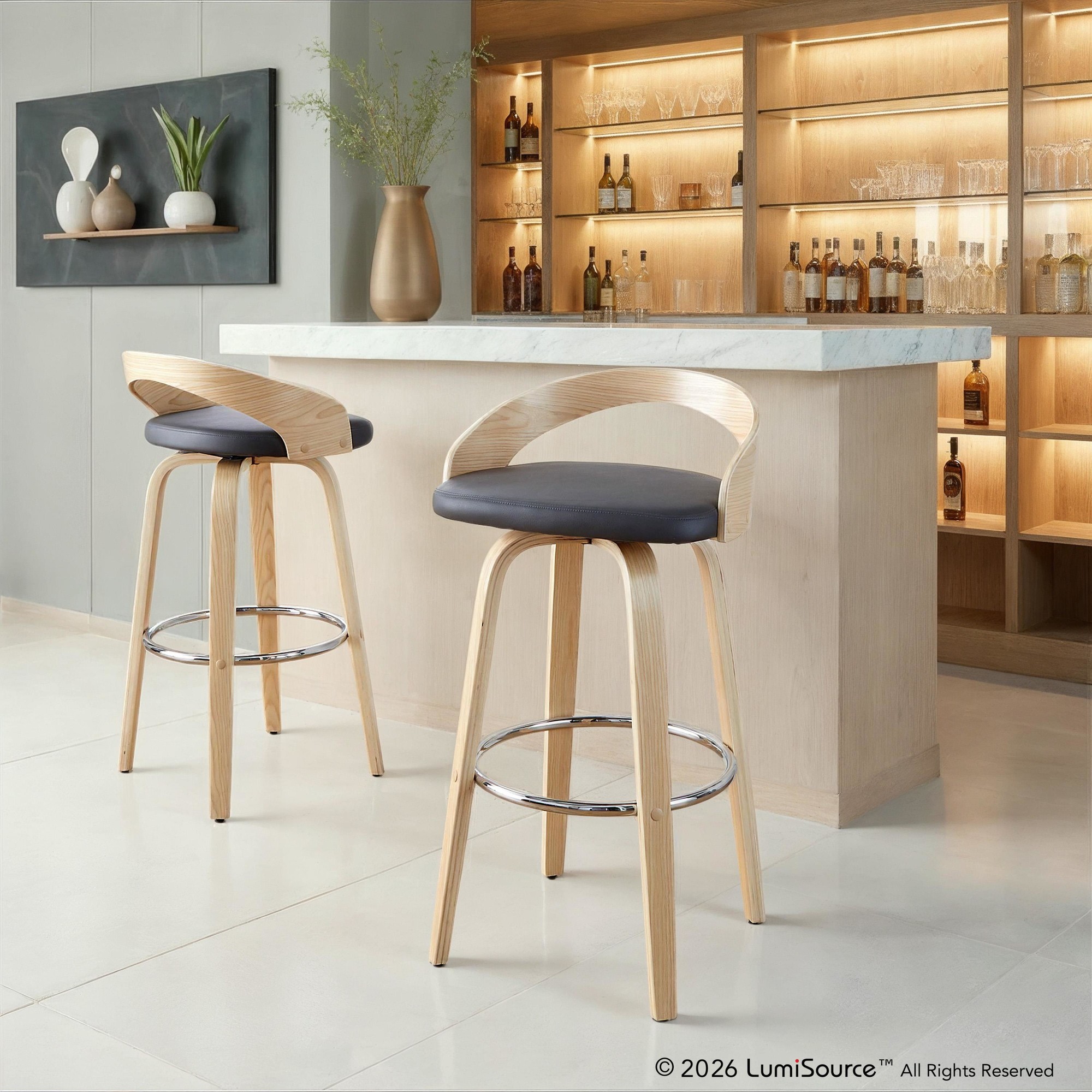 The Grotto Fixed-Height Barstool by LumiSource features a curved low back and rounded legs. This design radiates sophistication while modern features like a cushioned seat that swivels and wood legs with built-in footrest bring this piece into a class all of its own. Available in various color options, choose the one that suits your space best.
