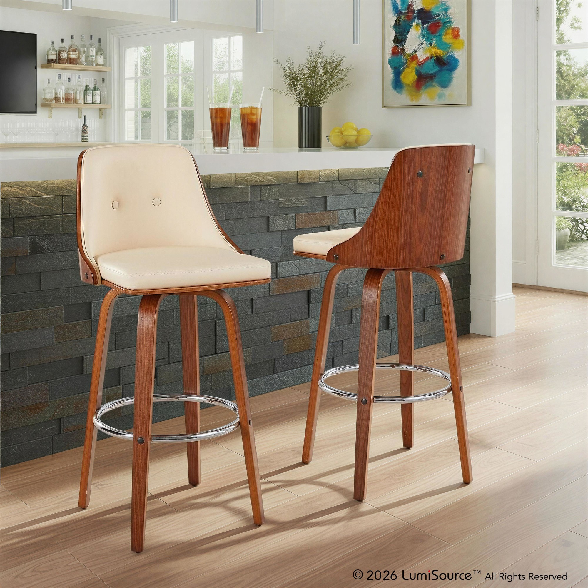 Inviting and refined with a hint of heritage design, the Gianna Fixed-Height Barstool by LumiSource will add a touch of class to any space. The Gianna features a contoured wooden back, bent wood tapered legs, and dual-tufted faux leather seat. Available in various colors.