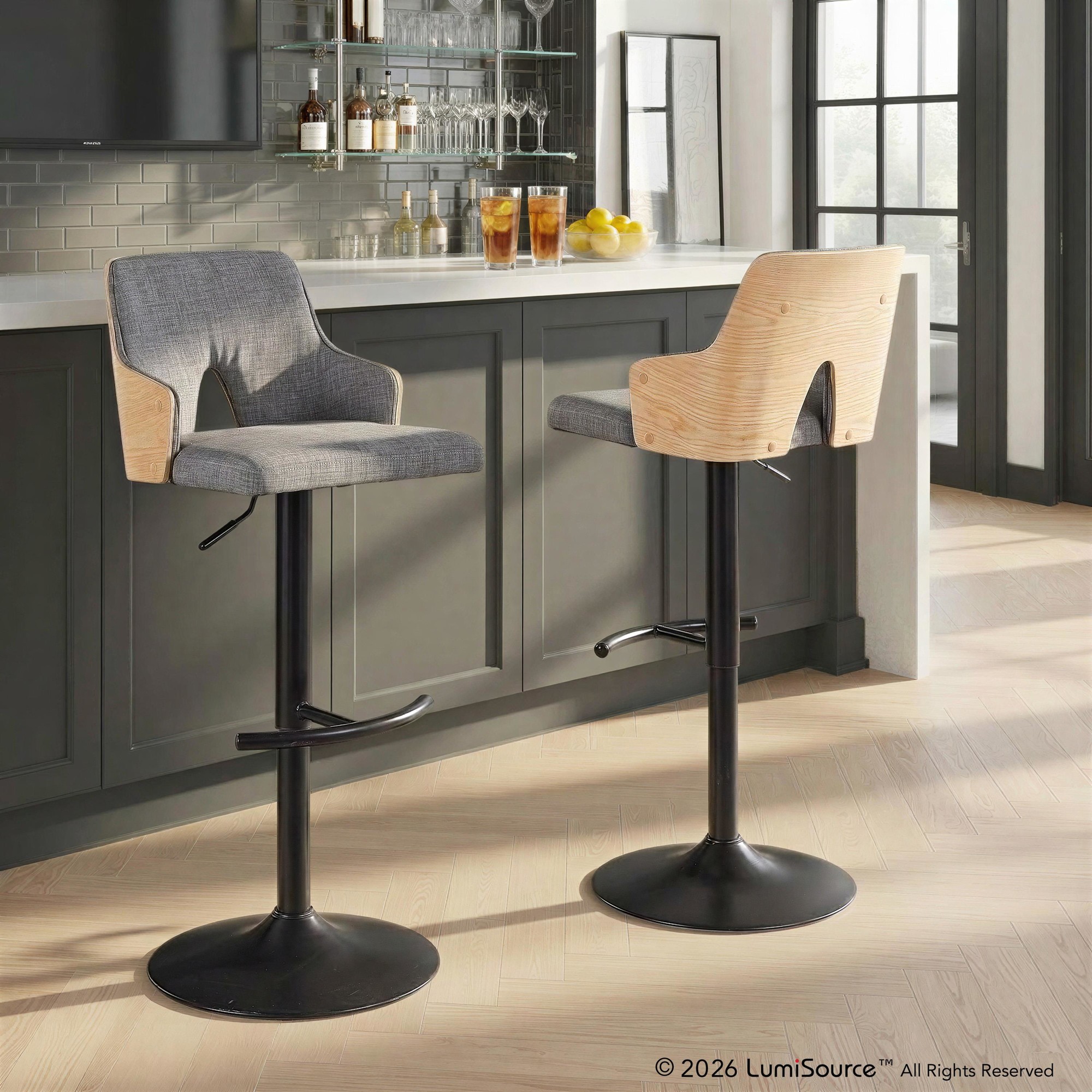 With its peek-a-boo wood back, the Stella Adjustable Barstool by LumiSource is both playful and refined, spirited and sophisticated. Add the understated wood armrests, fabric seat, and adjustable metal base, this design is perfect for any space or decor style. Available in various color.