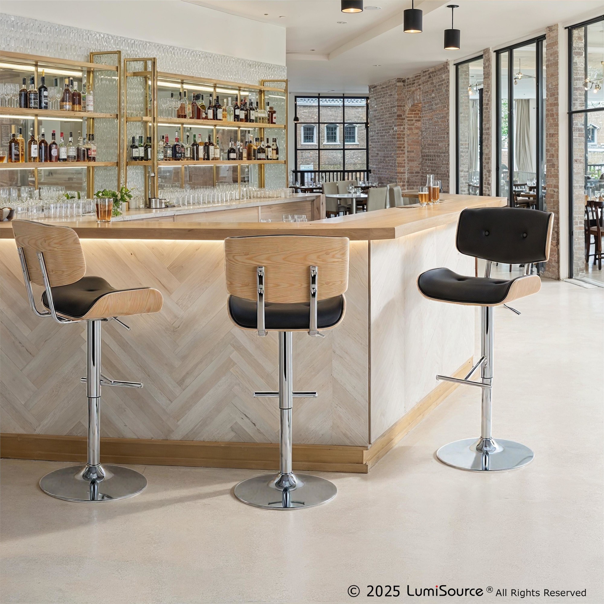 Add mid-Century flair to your bar or counter area with the LumiSource Lombardi Adjustable Barstool. Enjoy the plush tufted faux leather seats and backrest over bent wood providing optimal support and comfort. The Lombardi adjusts to your preferred height and swivels 360 degrees. Available in a variety of finishes, choose the color that suits your space best.