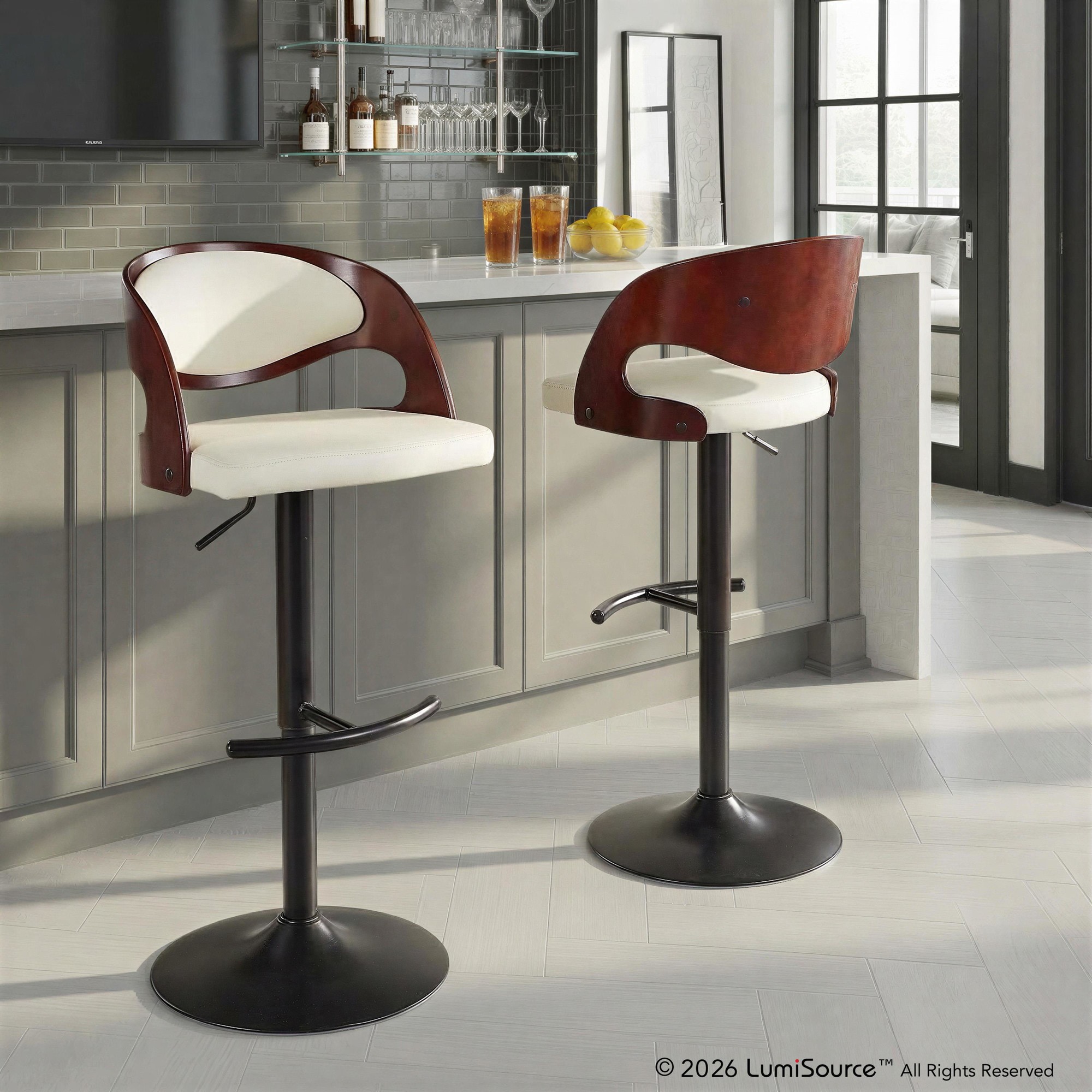 Uncork great kitchen and bar design with the Pino Adjustable Barstool by LumiSource featuring a polished bent wood back and upholstered seat. Hydraulics with 360 degree turn allow for easy adjustment and rich color combinations add a lively spirit to this unique stool.