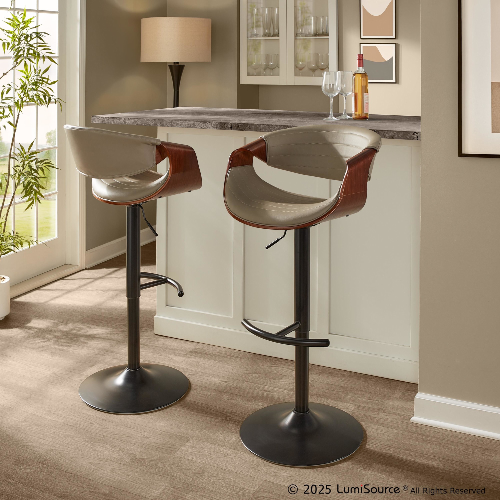 The unique design and silhouette of the Symphony Adjustable Barstool by LumiSource will look great in any space! The upholstery is accented with vertical tufting and the stool features both a swivel functionality and a footrest creating a practical and stylish stool. The Symphony comes in a variety of colors, so select one that fits your style today!