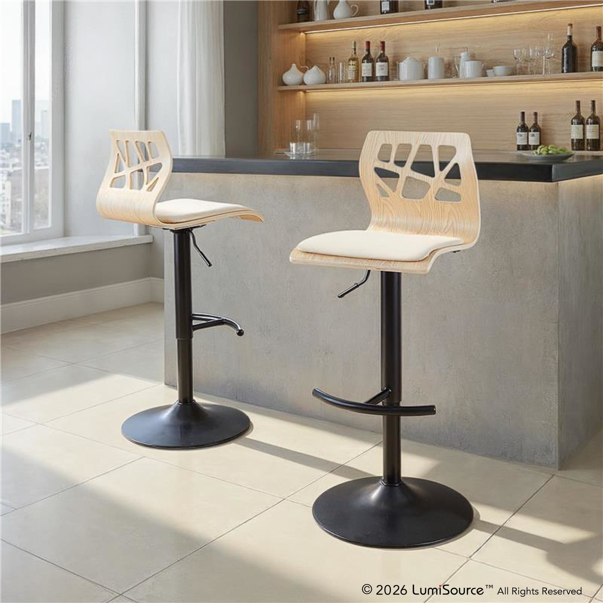 The curved wood frame and cut-out backrest of the Folia Adjustable Barstool by LumiSource will add a touch of style to any seating area. Featuring a built-in footrest and an upholstered padded swivel seat, this Folia stool is both stylish and comfortable. Available in several fabric and color options, choose the one that suits your space best!