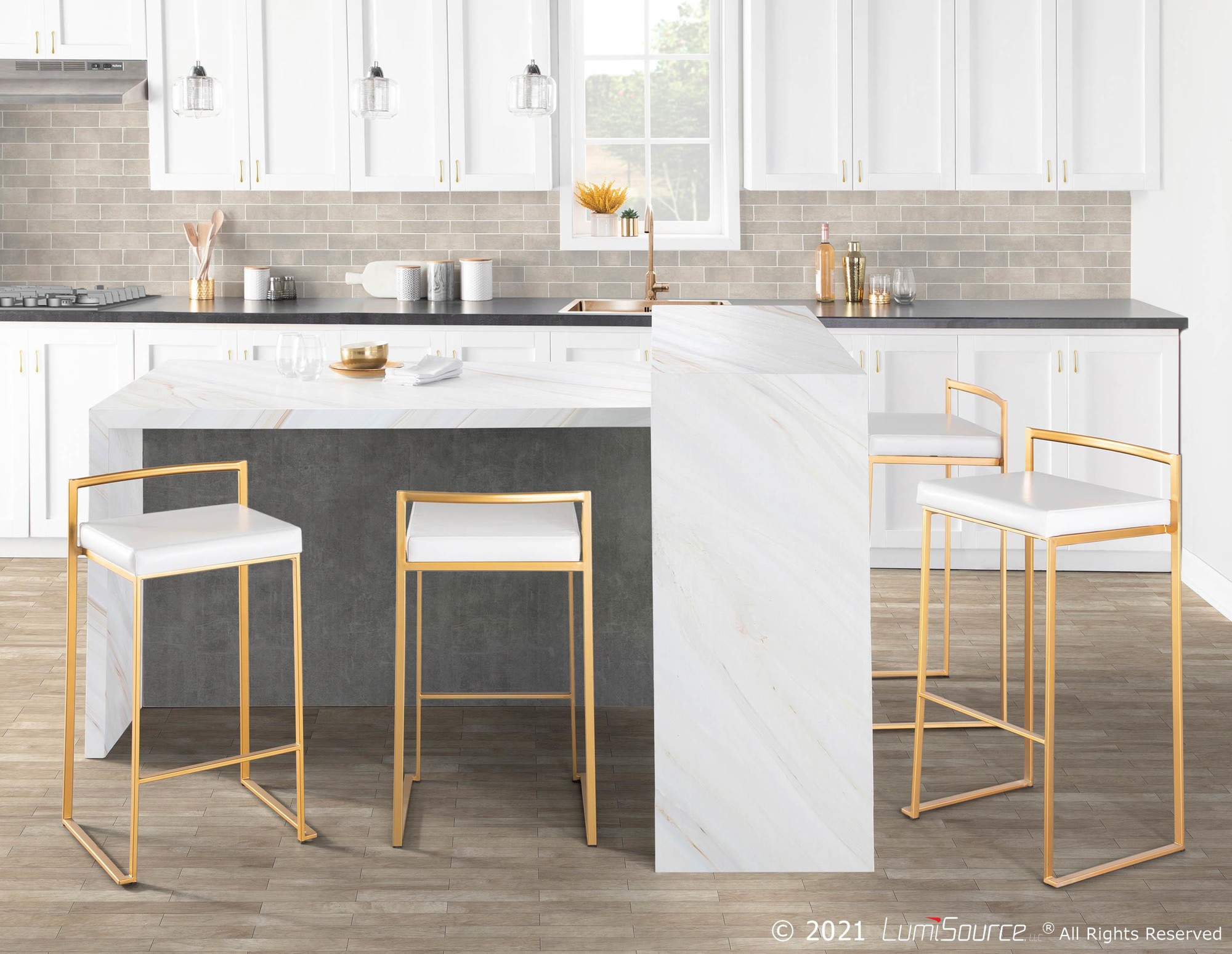 The simple elegance of the original design LumiSource Fuji Stacker Barstool belies its astonishing comfort. Lightweight thin lines create a simplistic fully assembled frame and backrest to support a thick padded seat cushion. A stackable design for easy storage makes this a great stool for entertaining. With its simple stylishness, the Fuji is sure to match any decor. Available in many color combinations, choose the look that best fits your dining space.
