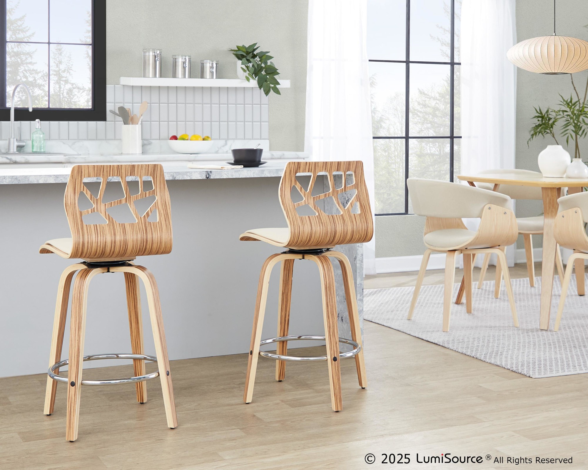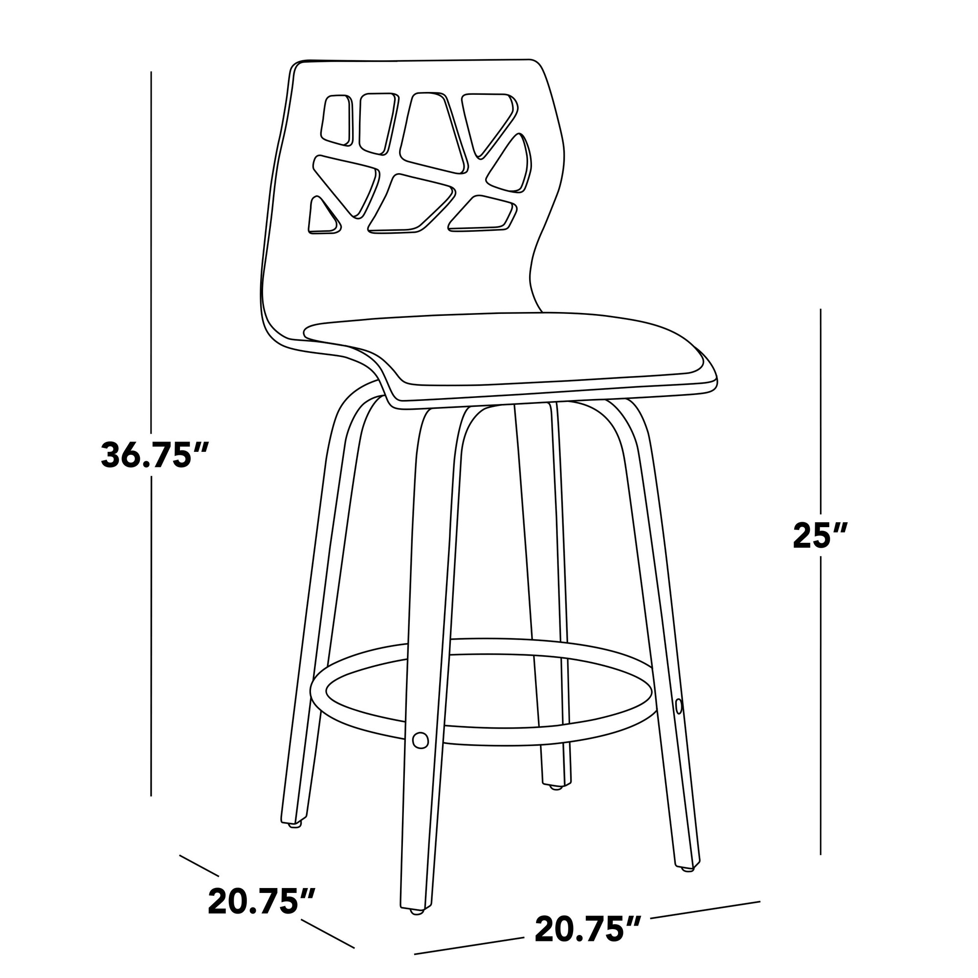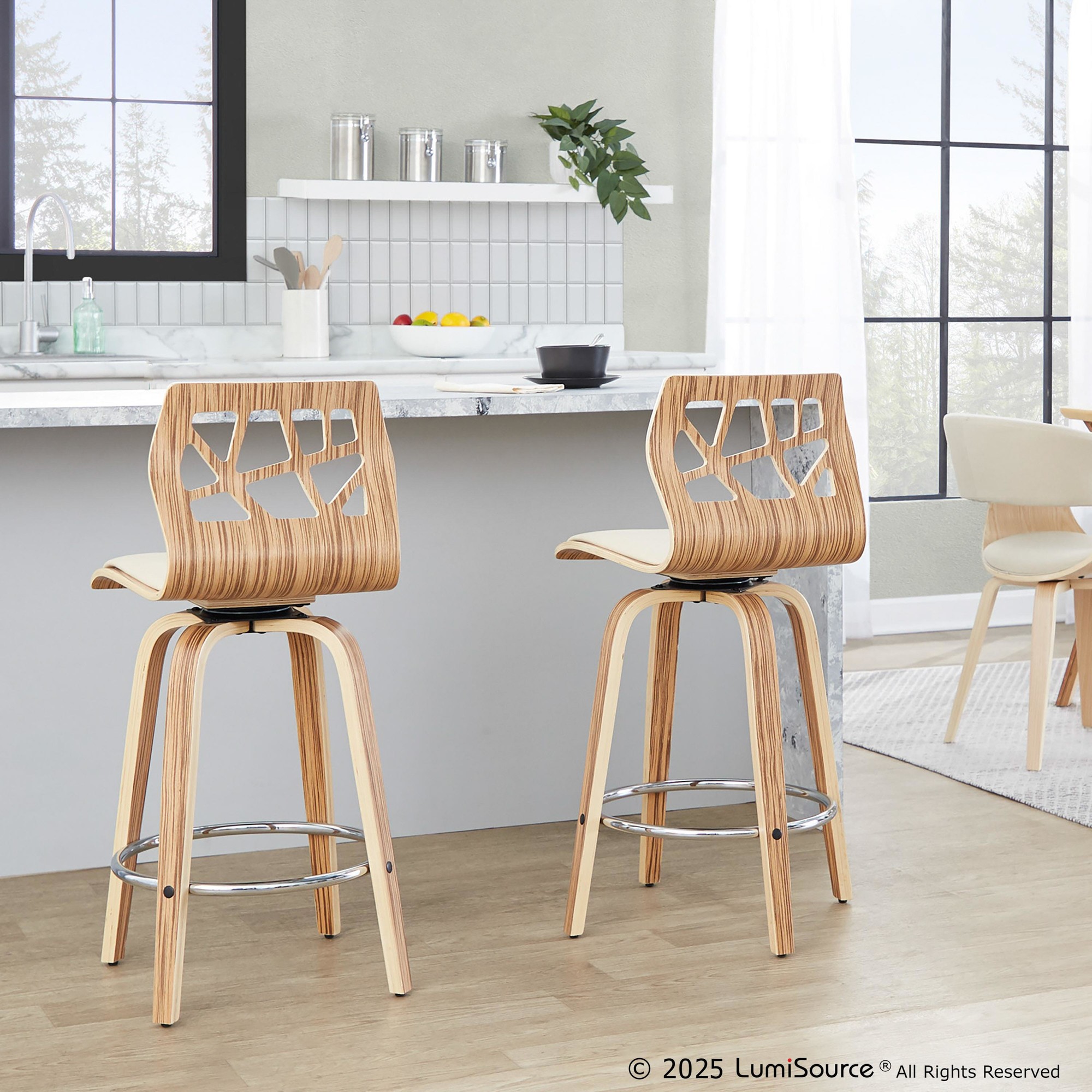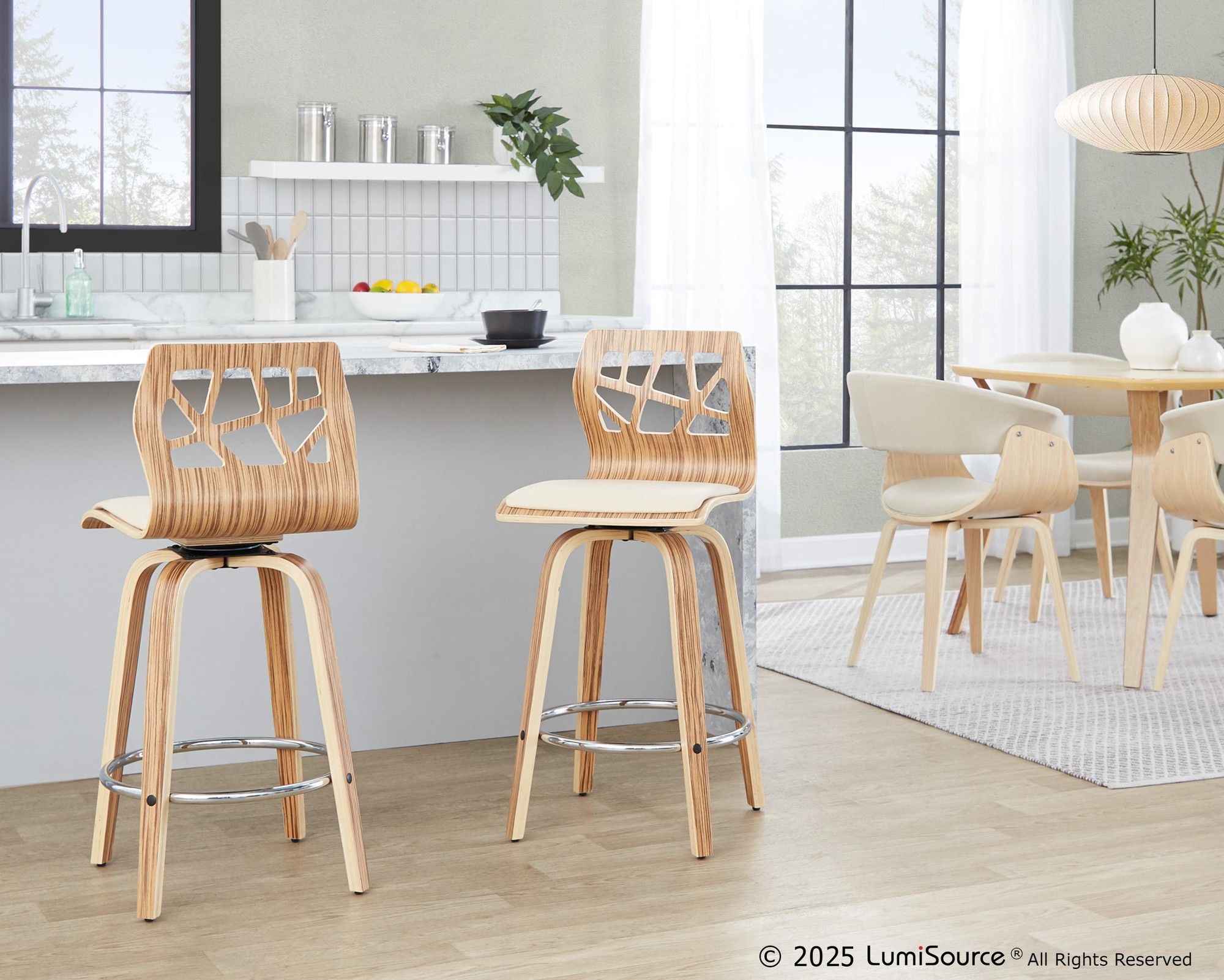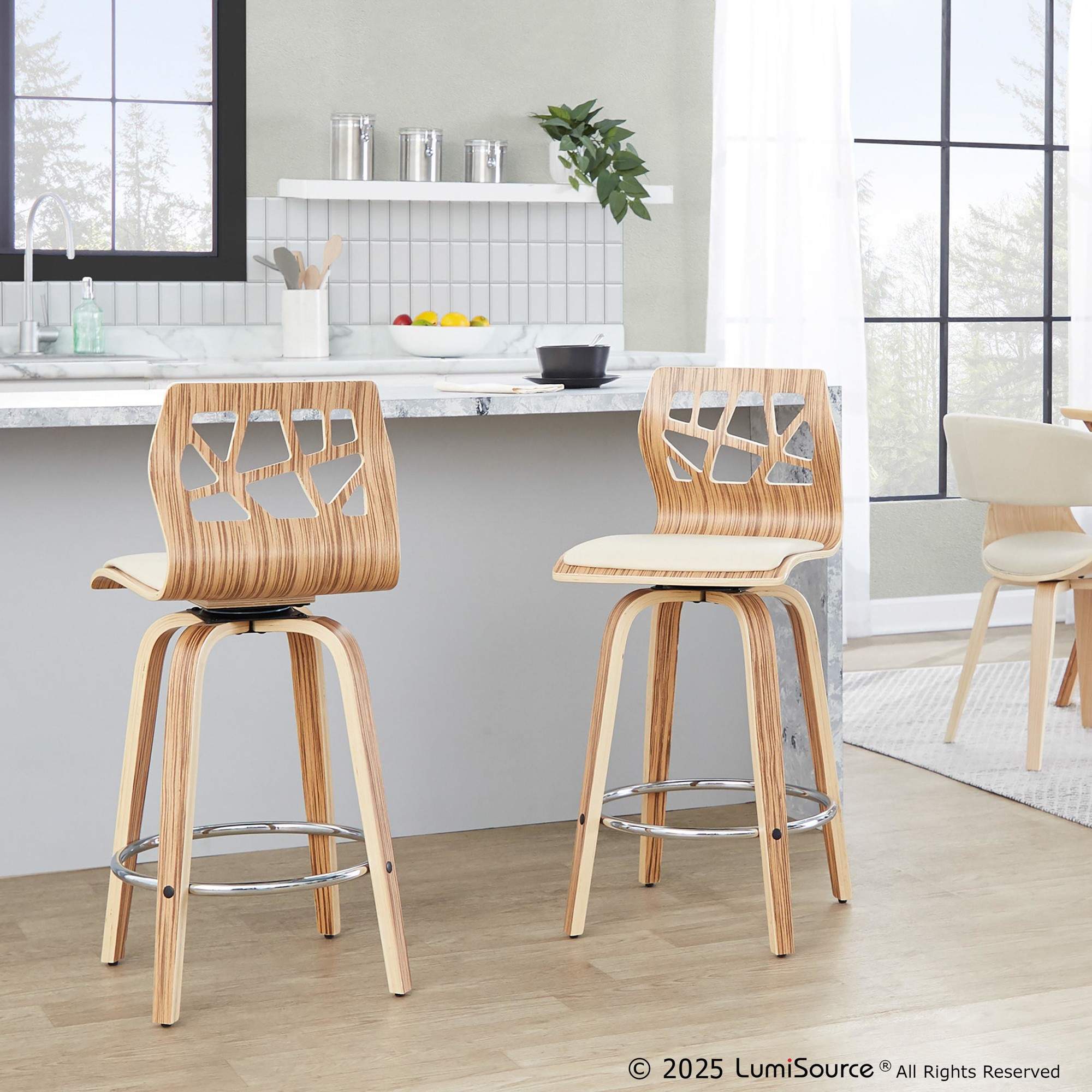 The curved wood frame and cut-out backrest of the Folia Fixed-Height Counter Stool by LumiSource will add a touch of style to your counter area. Featuring a stationary frame with a zebra wood finish, a round built-in footrest, and an upholstered padded seat, the Folia Counter Stool is stylish and comfortable. Available in various color options, choose the one that suits your space best!