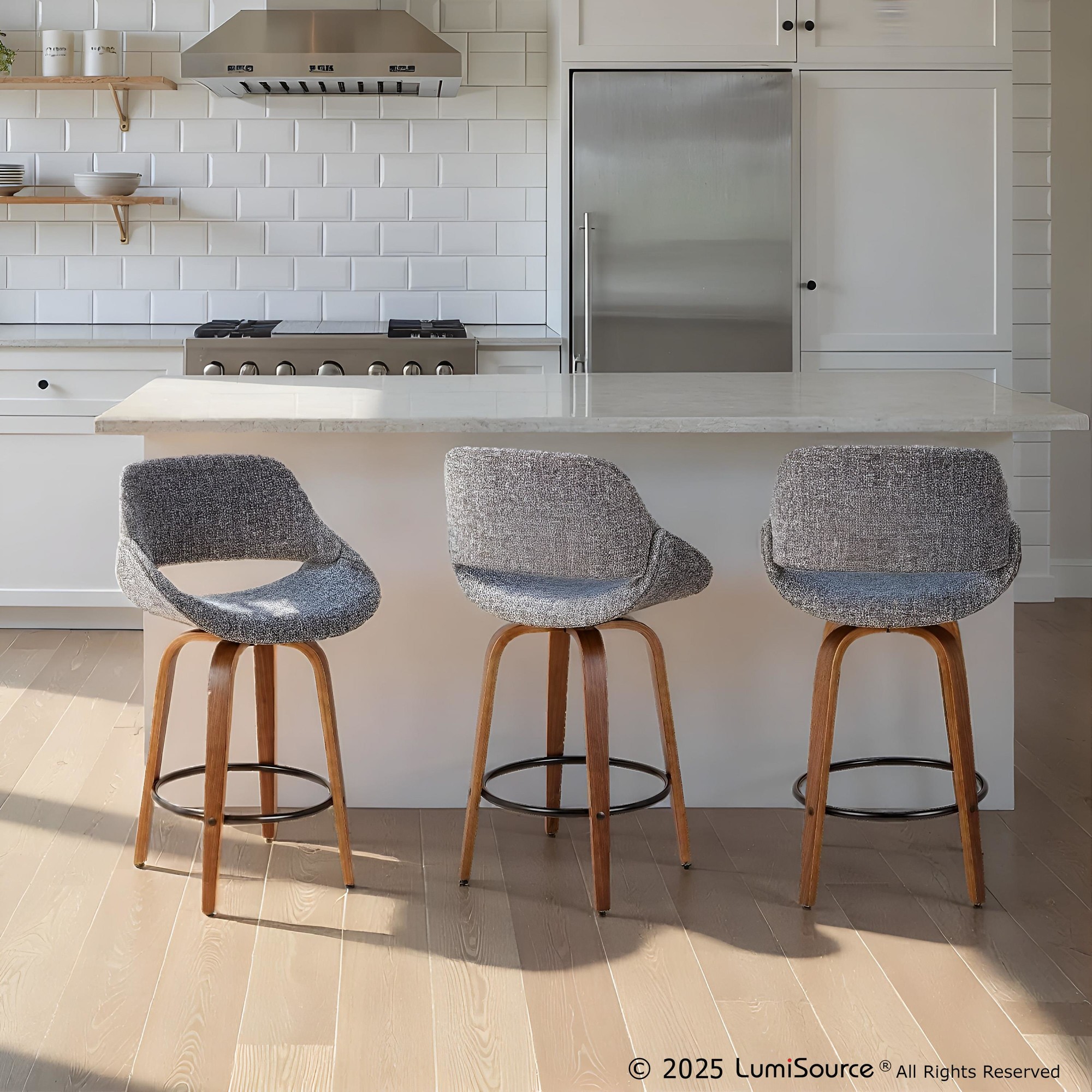 The wide and welcoming seat of the LumiSource Fabrico Counter Stool beckons one to sit and relax. A curved back and contoured upholstered seat is accented by flared walnut wood swivel legs that add to the stylish yet comfortable design. Available in a variety of upholstery colors, choose the one that suits your space best.