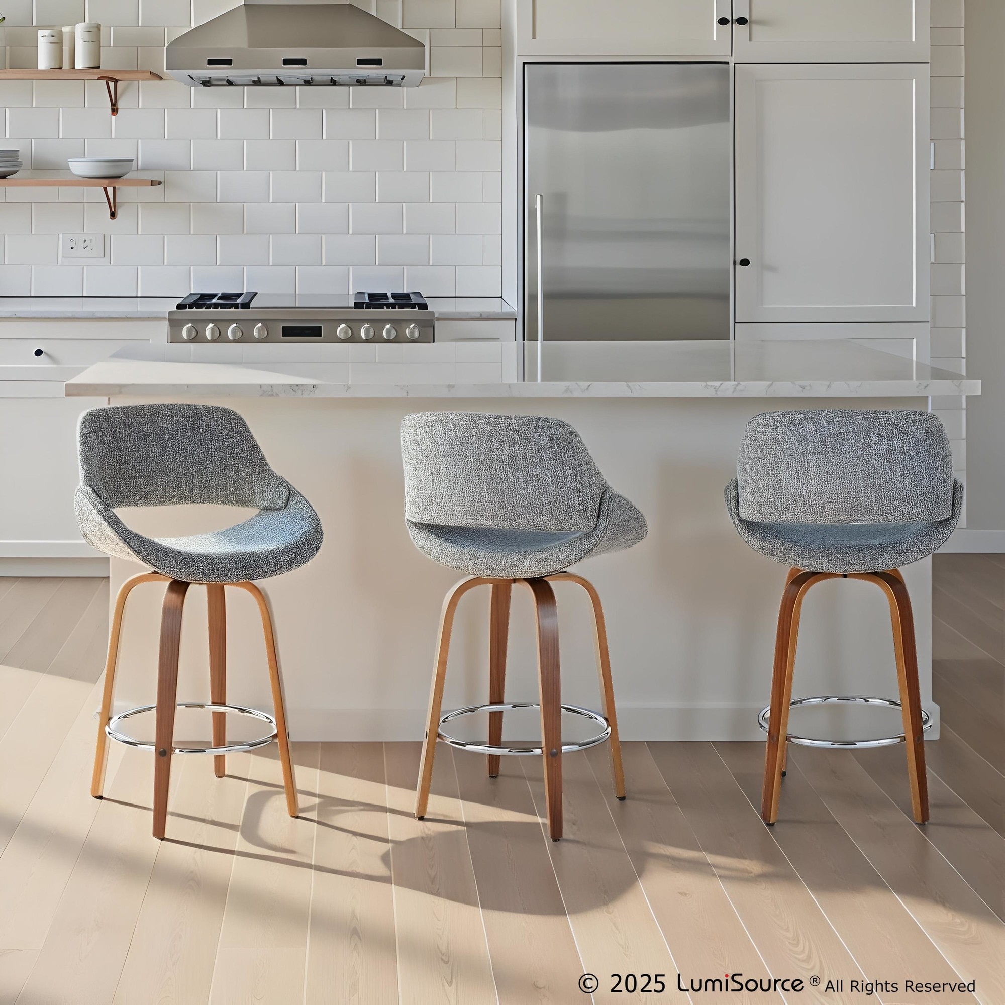 The wide and welcoming seat of the LumiSource Fabrico Counter Stool beckons one to sit and relax. A curved back and contoured upholstered seat is accented by flared walnut wood swivel legs that add to the stylish yet comfortable design. Available in a variety of upholstery colors, choose the one that suits your space best.