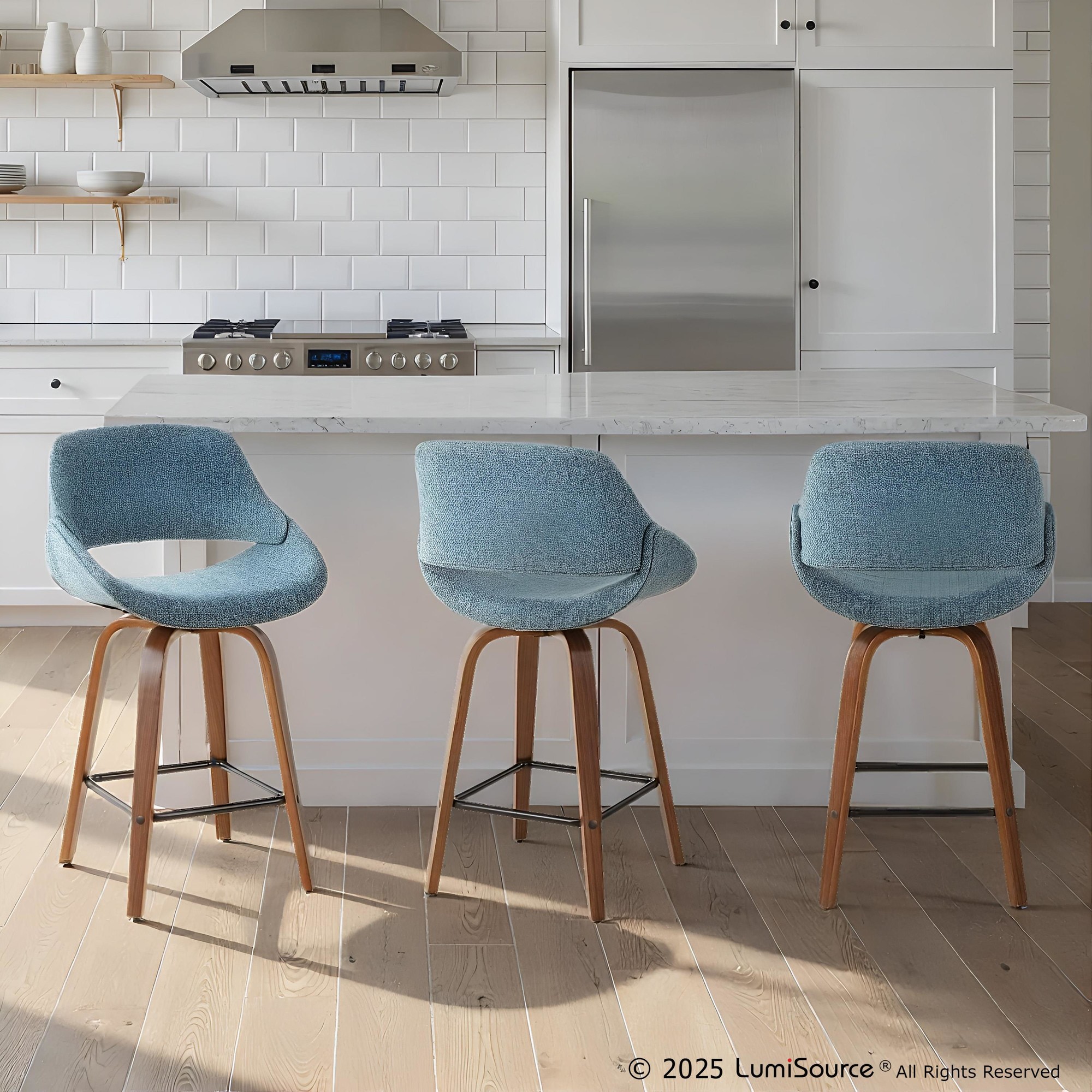 The wide and welcoming seat of the LumiSource Fabrico Counter Stool beckons one to sit and relax. A curved back and contoured upholstered seat is accented by flared walnut wood swivel legs that add to the stylish yet comfortable design. Available in a variety of upholstery colors, choose the one that suits your space best.