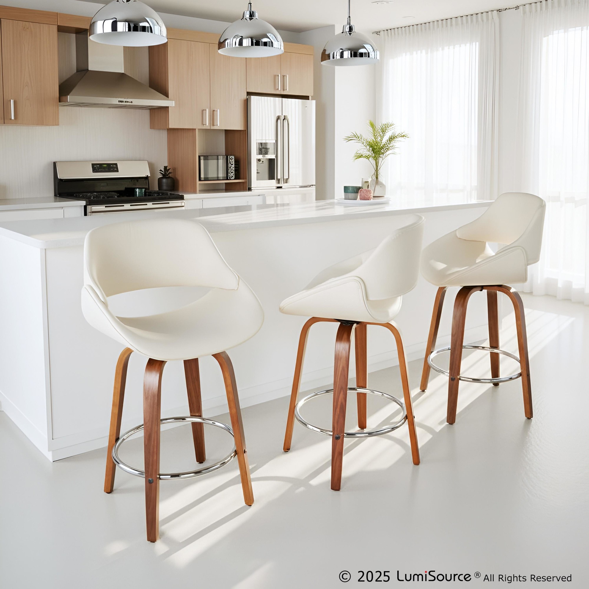 The wide and welcoming seat of the LumiSource Fabrico Counter Stool beckons one to sit and relax. A curved back and contoured upholstered seat is accented by flared walnut wood swivel legs that add to the stylish yet comfortable design. Available in a variety of upholstery colors, choose the one that suits your space best.