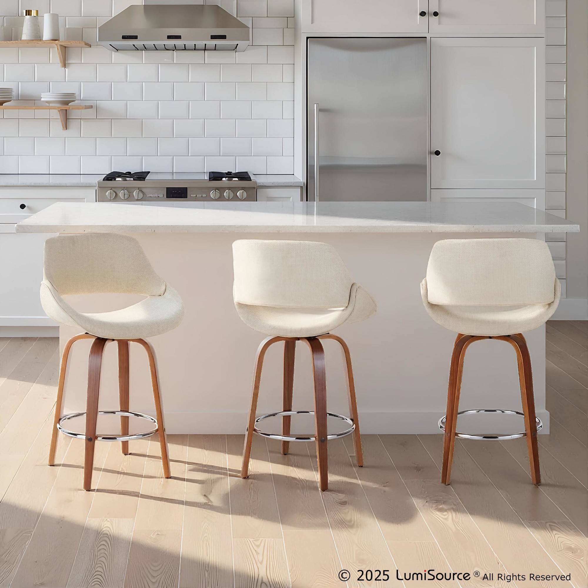 The wide and welcoming seat of the LumiSource Fabrico Counter Stool beckons one to sit and relax. A curved back and contoured upholstered seat is accented by flared walnut wood swivel legs that add to the stylish yet comfortable design. Available in a variety of upholstery colors, choose the one that suits your space best.