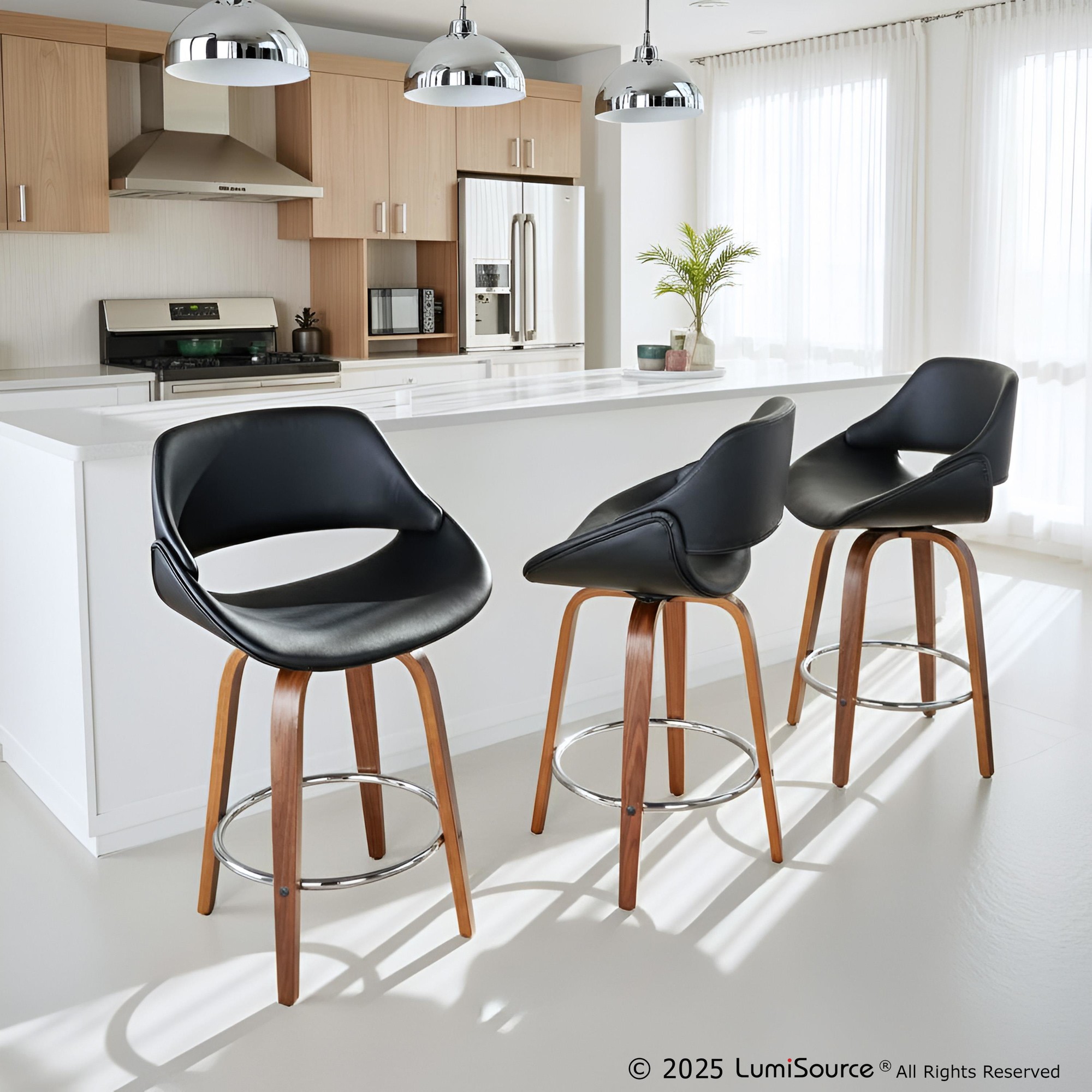 The wide and welcoming seat of the LumiSource Fabrico Counter Stool beckons one to sit and relax. A curved back and contoured upholstered seat is accented by flared walnut wood swivel legs that add to the stylish yet comfortable design. Available in a variety of upholstery colors, choose the one that suits your space best.