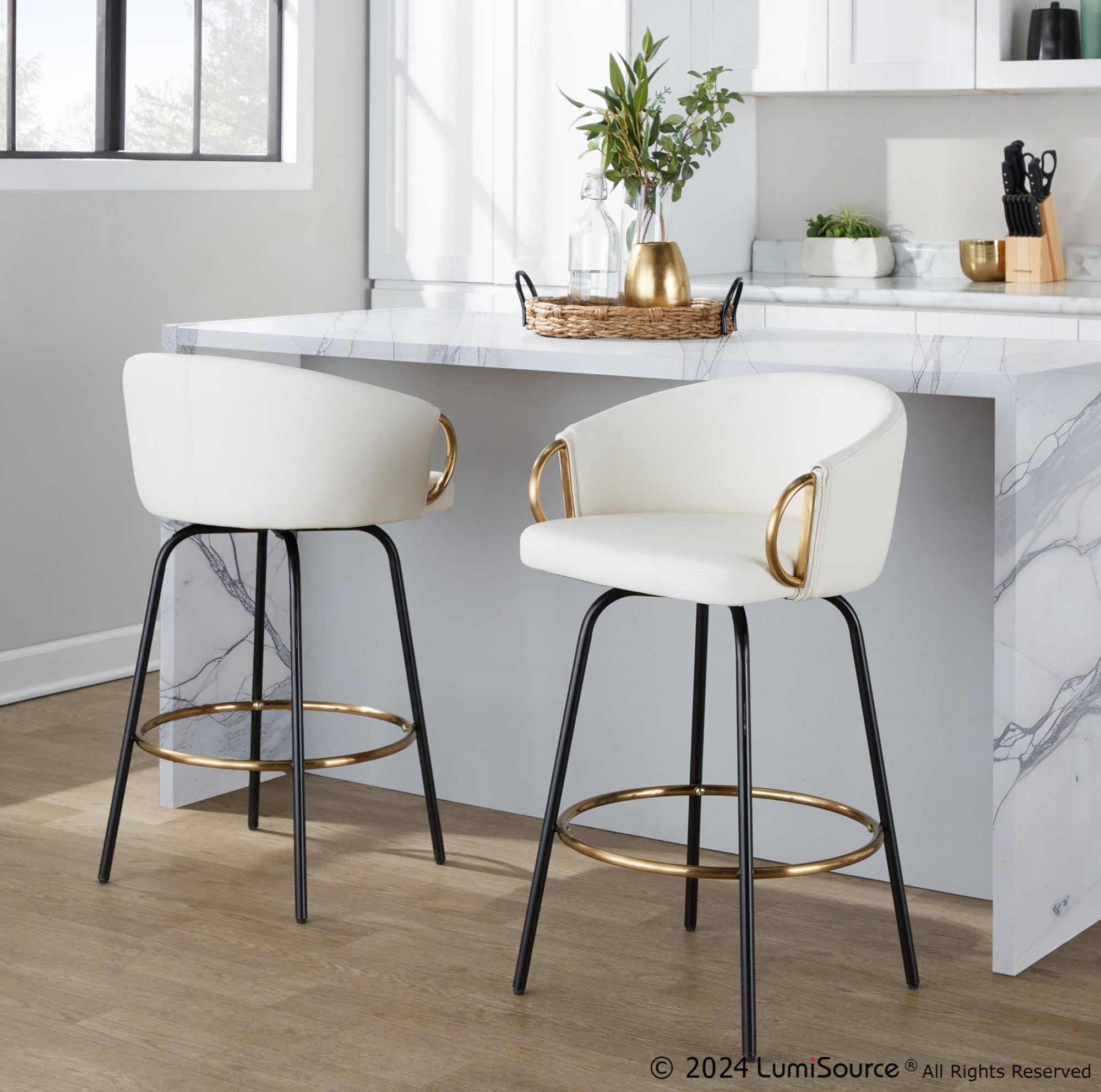 Chic modern style shines bright with the unique design of the Claire Fixed-Height Counter Stool by LumiSource. With a rounded and low backrest, sleek metal armrests and frame, it's the perfect piece for your contemporary bar area. The Claire Counter Stool has smooth swivel capability with plush upholstery. Available in various bold colors.