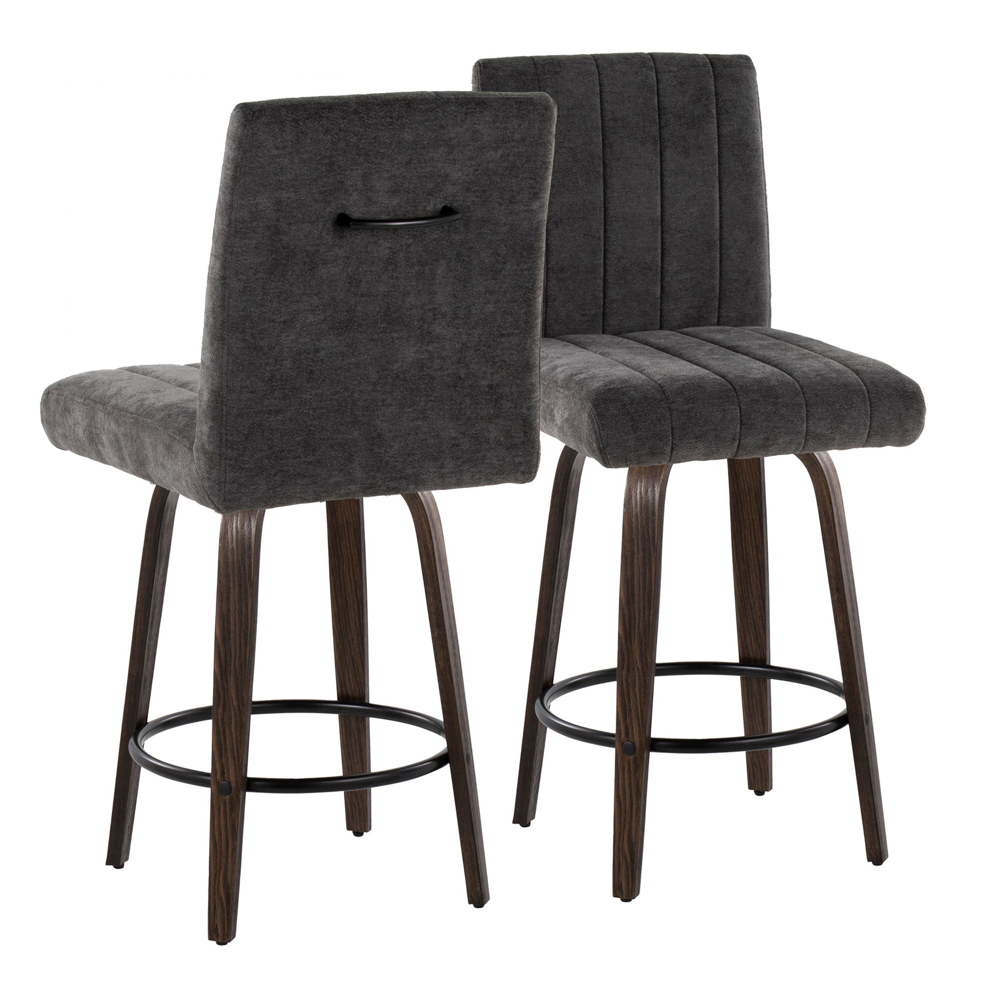 Introducing the Hank Fixed-Height Counter Stool by LumiSource, a modern masterpiece that combines style and comfort. Featuring a plush tufted cushioned seat with a decorative handle adorning the seat back and a sturdy wood frame, this swivel stool adds a touch of sophistication to any kitchen or dining area. With its sleek tapered legs and 360-degree rotation, the Hank provides both form and function, making it the perfect seating solution for your home.