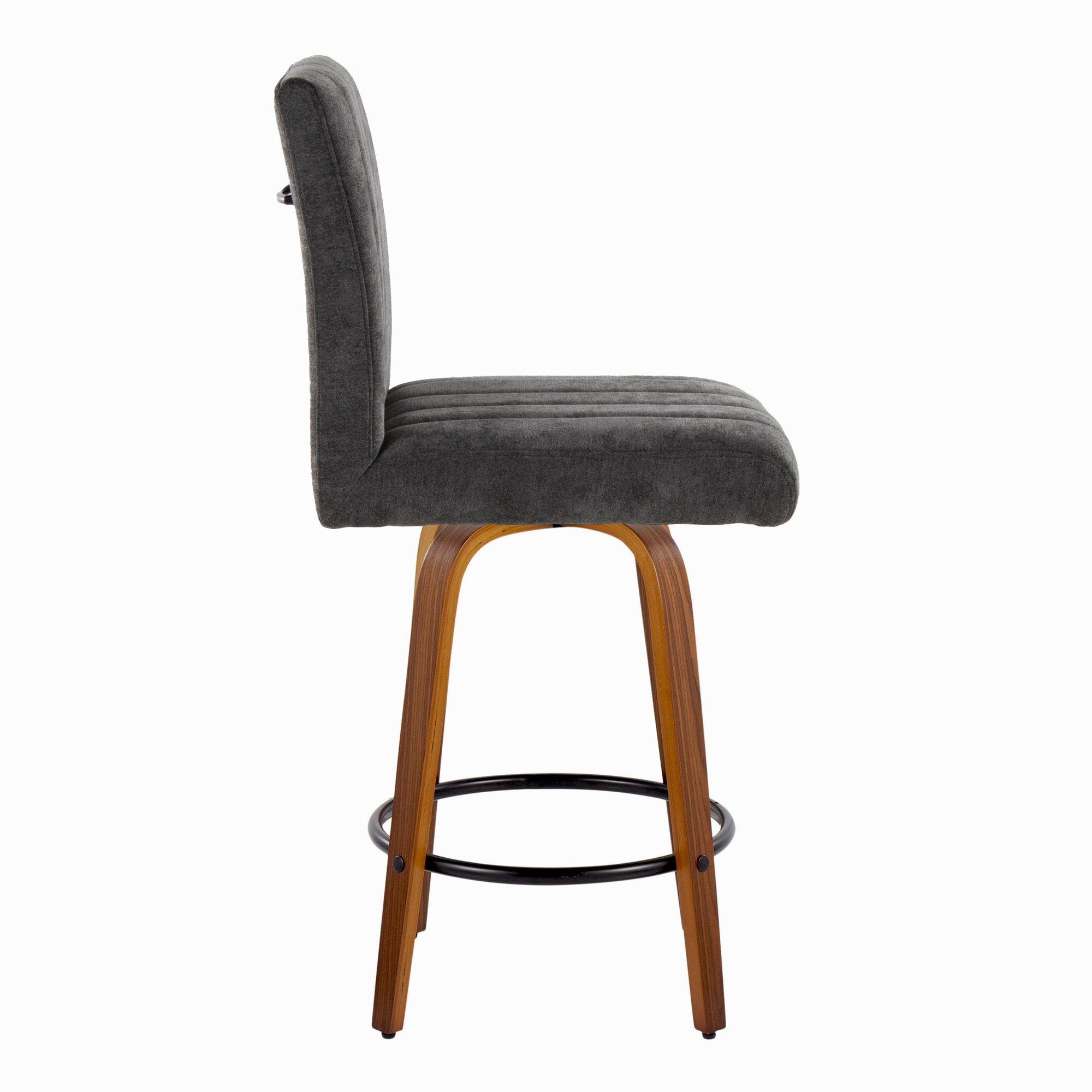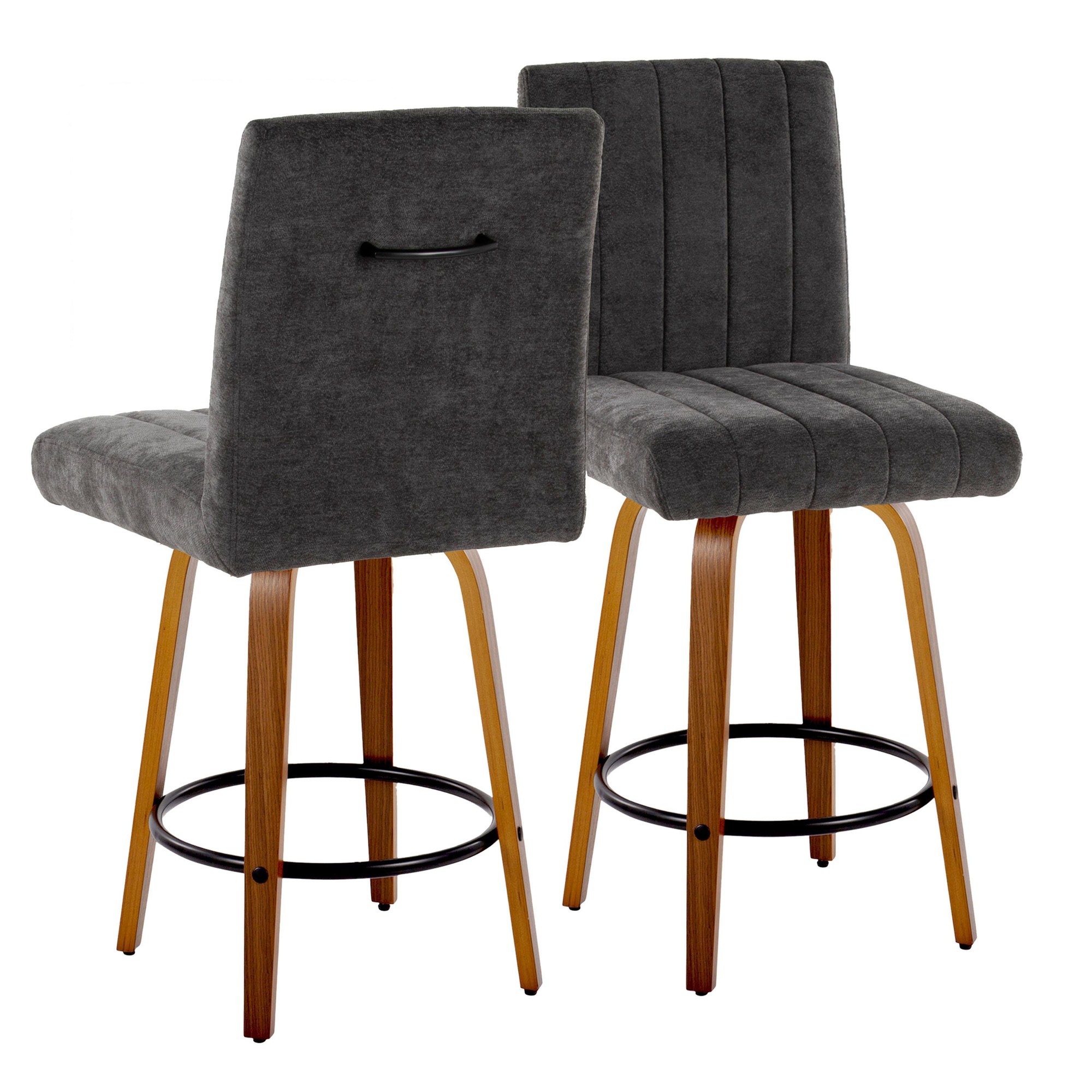 Introducing the Hank Fixed-Height Counter Stool by LumiSource, a modern masterpiece that combines style and comfort. Featuring a plush tufted cushioned seat with a decorative handle adorning the seat back and a sturdy wood frame, this swivel stool adds a touch of sophistication to any kitchen or dining area. With its sleek tapered legs and 360-degree rotation, the Hank provides both form and function, making it the perfect seating solution for your home.