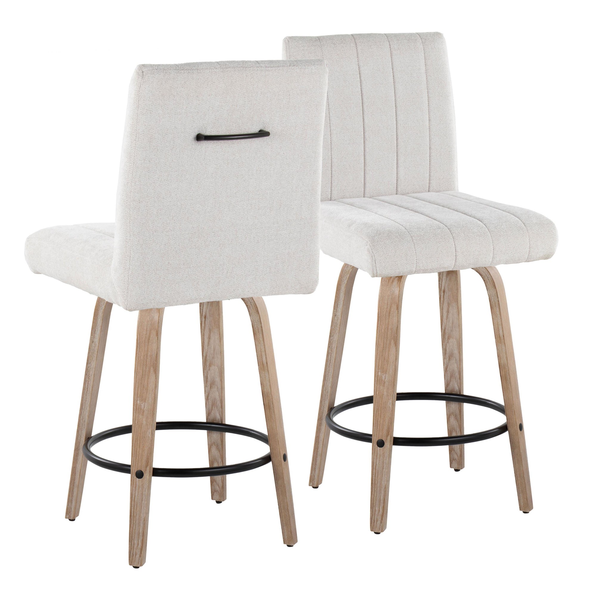 Introducing the Hank Fixed-Height Counter Stool by LumiSource, a modern masterpiece that combines style and comfort. Featuring a plush tufted cushioned seat with a decorative handle adorning the seat back and a sturdy wood frame, this swivel stool adds a touch of sophistication to any kitchen or dining area. With its sleek tapered legs and 360-degree rotation, the Hank provides both form and function, making it the perfect seating solution for your home.