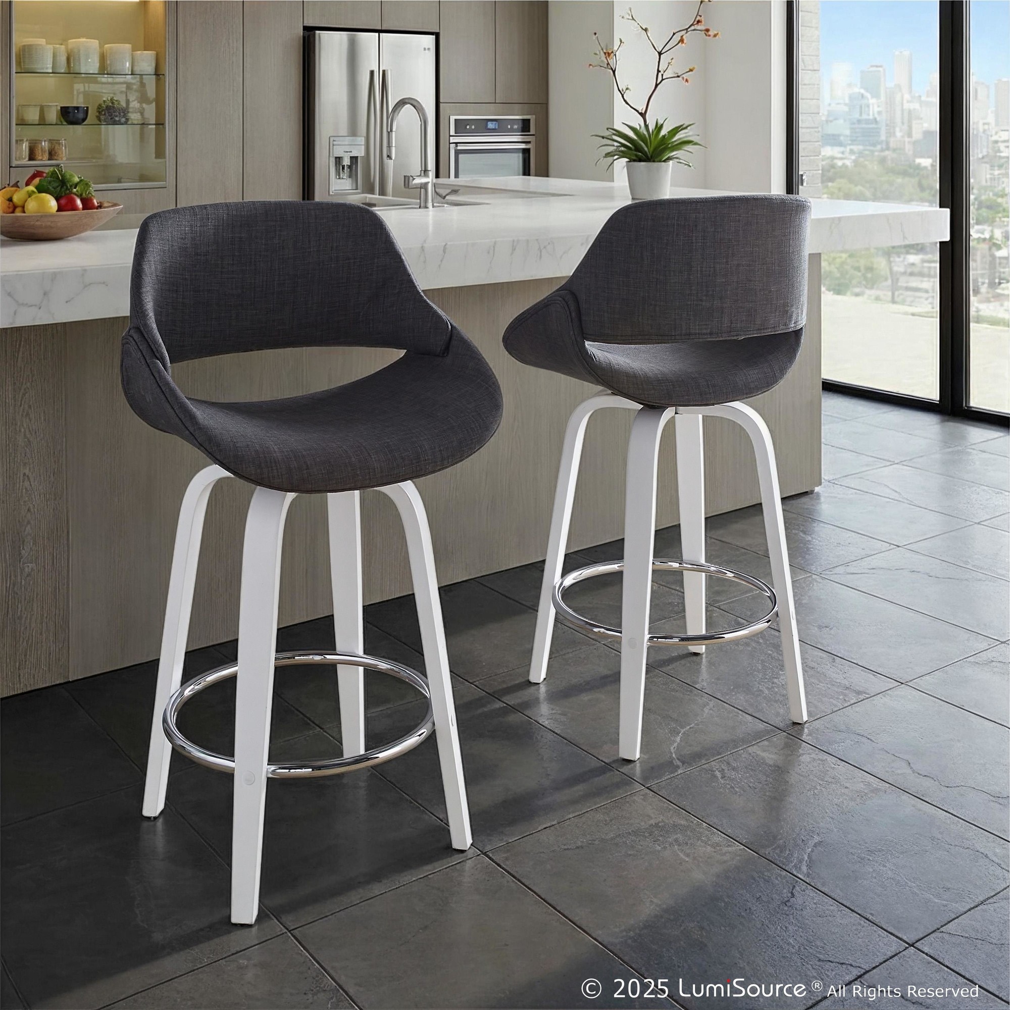 The wide and welcoming seat of the LumiSource Fabrico Counter Stool beckons one to sit and relax. A curved back and contoured upholstered seat is accented by white bent wood swivel legs that add to the stylish yet comfortable design. Available in a variety of upholstery colors that are sure to elevate any space.