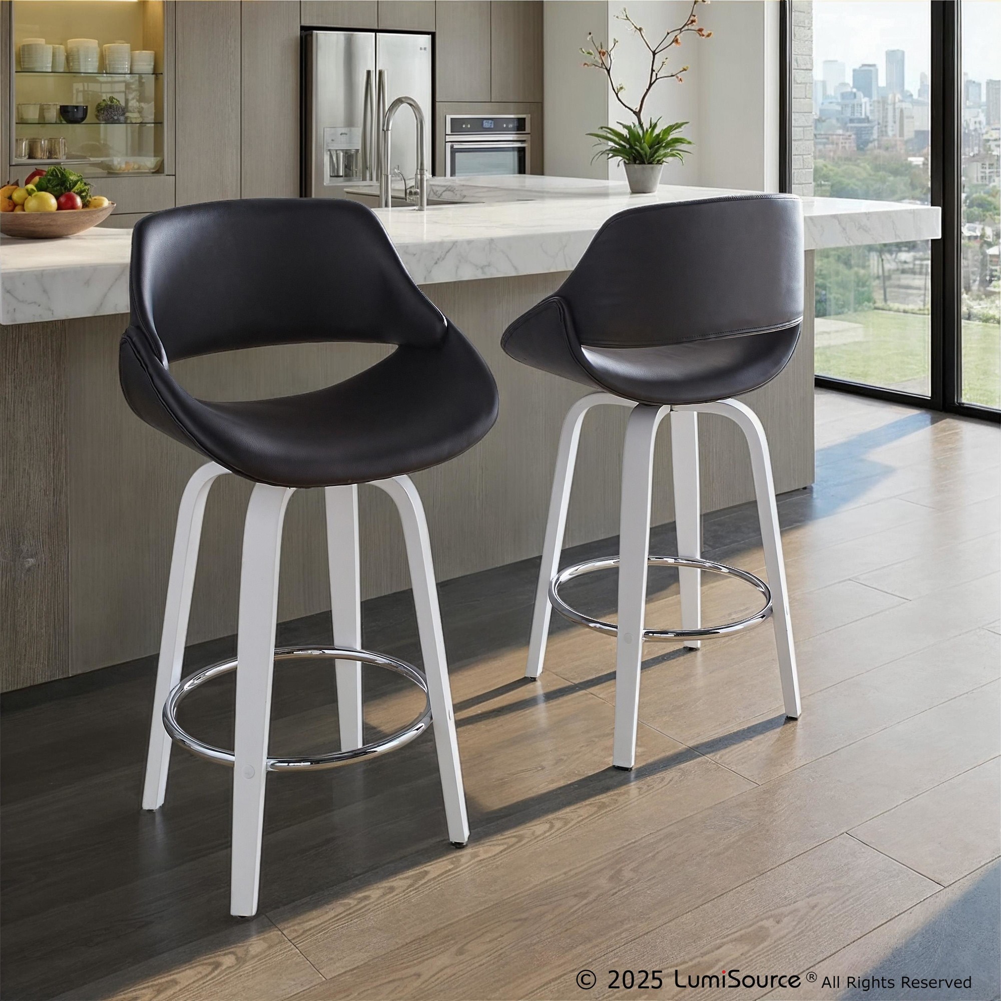 The wide and welcoming seat of the LumiSource Fabrico Counter Stool beckons one to sit and relax. A curved back and contoured upholstered seat is accented by white bent wood swivel legs that add to the stylish yet comfortable design. Available in a variety of upholstery colors that are sure to elevate any space.