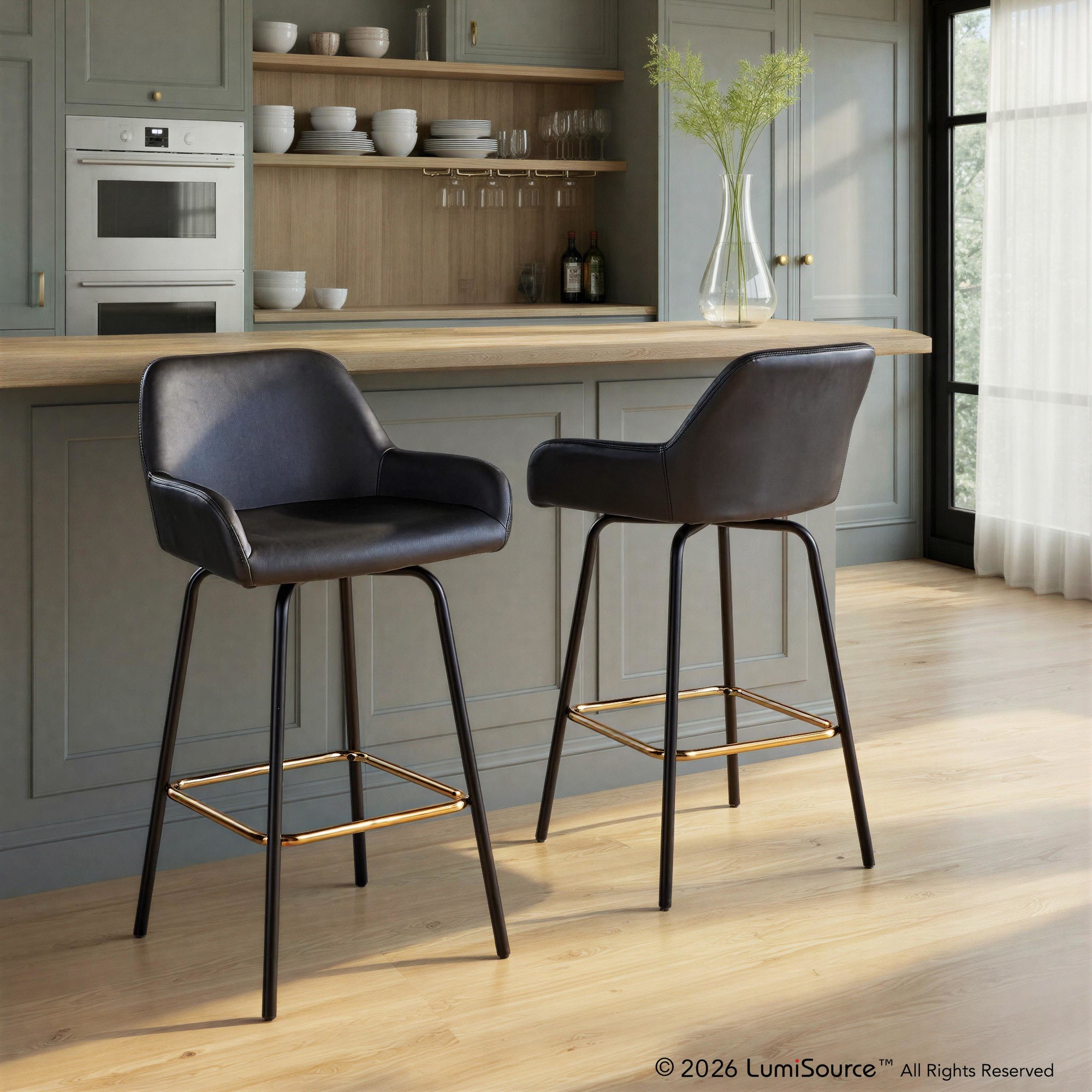 Add stylish and comfortable seating to your kitchen or counter area with the contemporary charm of the Daniella Fixed-Height Counter Stool by LumiSource. Featuring a sleek upholstered swivel seat, padded backrest, and stylish metal legs, this stool is sure to catch eyes. The Daniella is available in a variety of upholstery colors, so select one that suits your space the best!