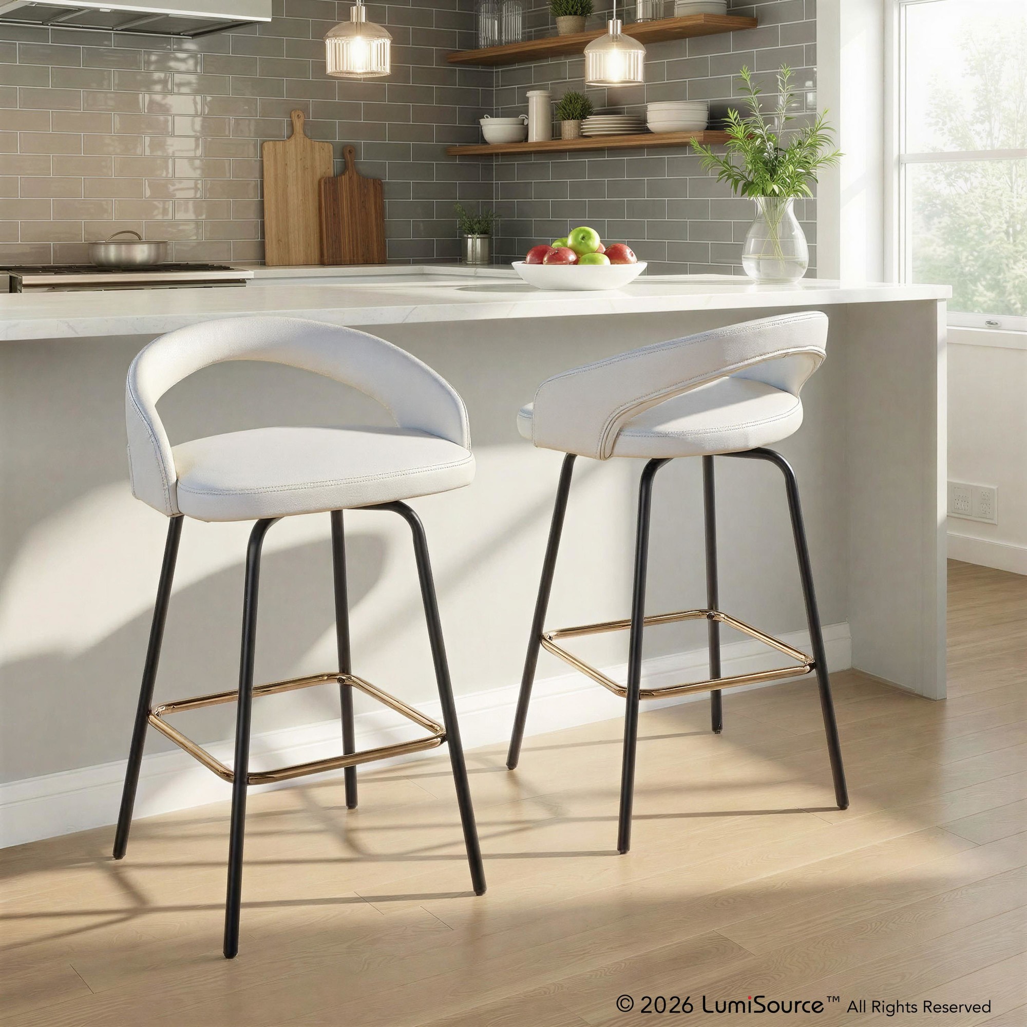 The Grotto Upholstered Fixed-Height Counter Stool by LumiSource brings a refined and versatile seating option to your kitchen. Featuring a fully upholstered seat and a low backrest, these stools offer both style and comfort. The clean-lined design of the frame complements the plush upholstery, allowing the Grotto stools to blend seamlessly into a variety of kitchen decor styles.
