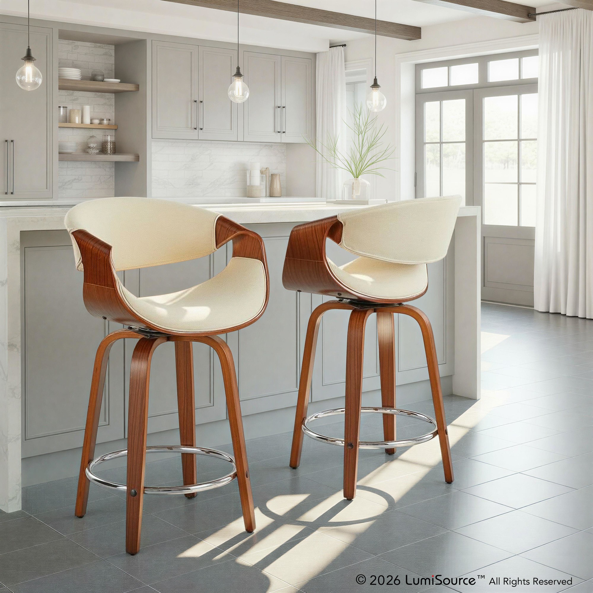 With a curvaceous dose of Mid-Century style, this unique design will look great at your counter area. Featuring a walnut finished stationary wood frame, luxurious woven fabric upholstery, swiveling seat, and stylish armrests. The Curvini is available in grey and cream, choose the color that fits your space the best.