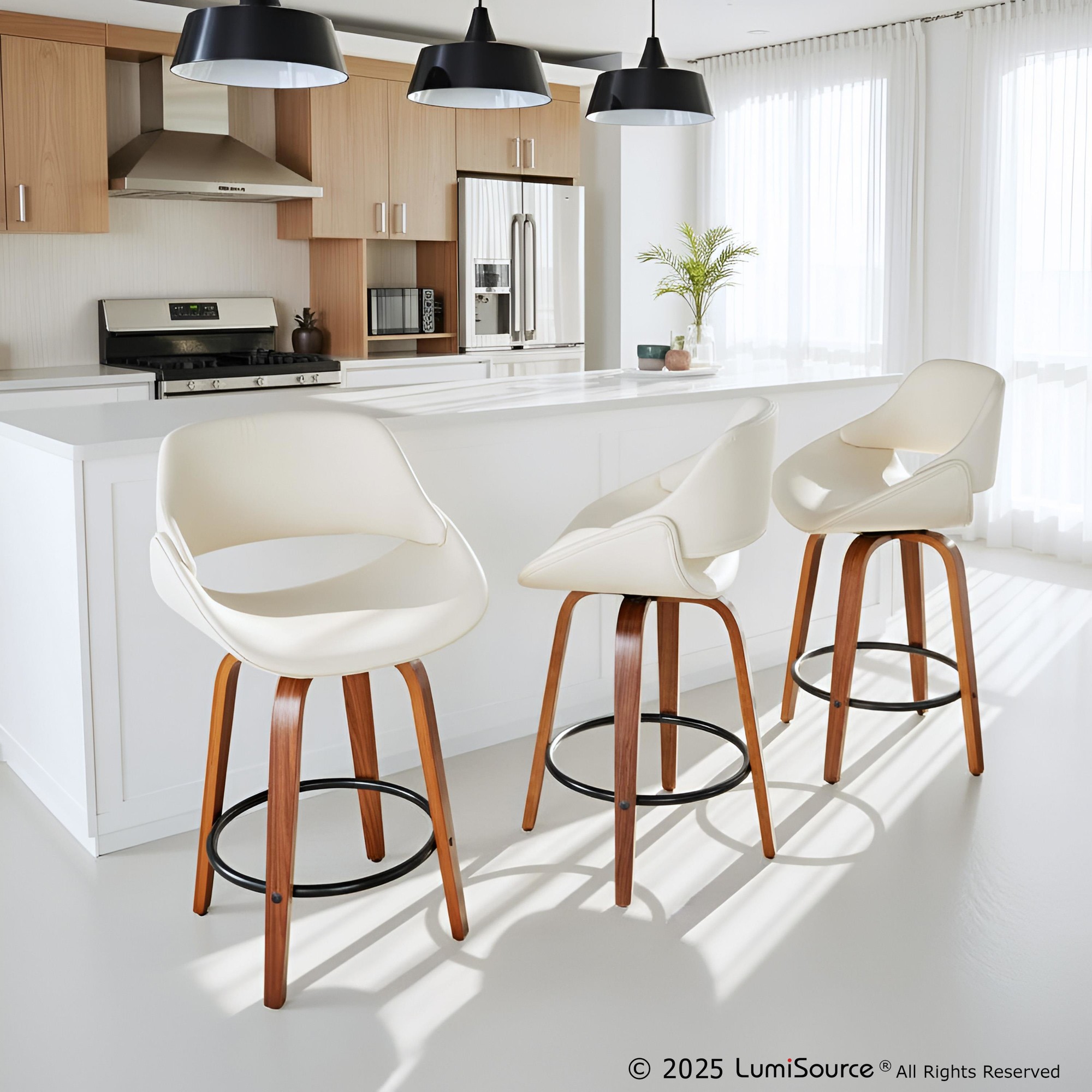 The wide and welcoming seat of the LumiSource Fabrico Counter Stool beckons one to sit and relax. A curved back and contoured upholstered seat is accented by flared walnut wood swivel legs that add to the stylish yet comfortable design. Available in a variety of upholstery colors, choose the one that suits your space best.