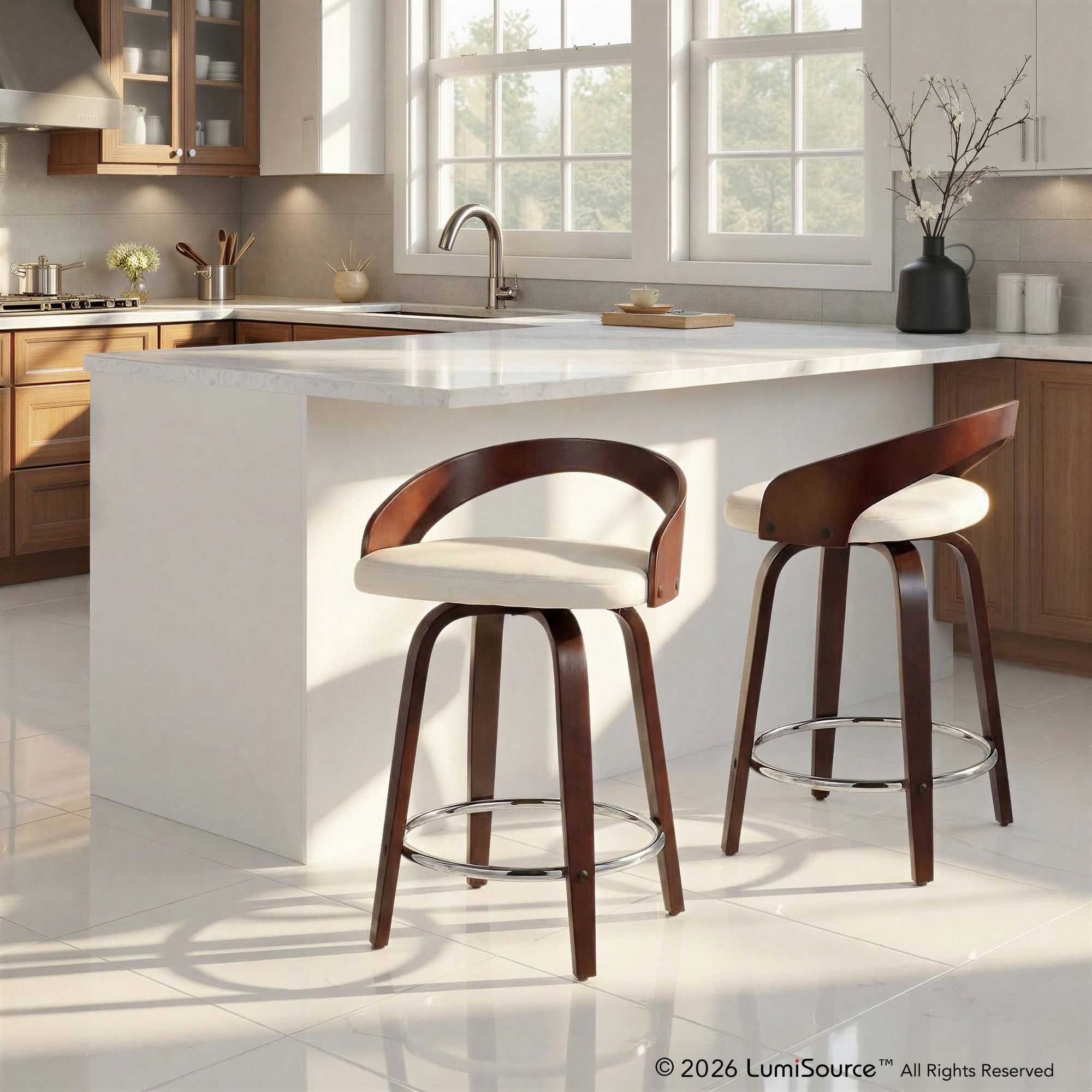 The LumiSource Grotto Counter Stool's curved low back and rounded legs radiate sophistication while modern features like a cushioned seat that swivels and a chrome footrest bring this piece into a contemporary class all of its own.