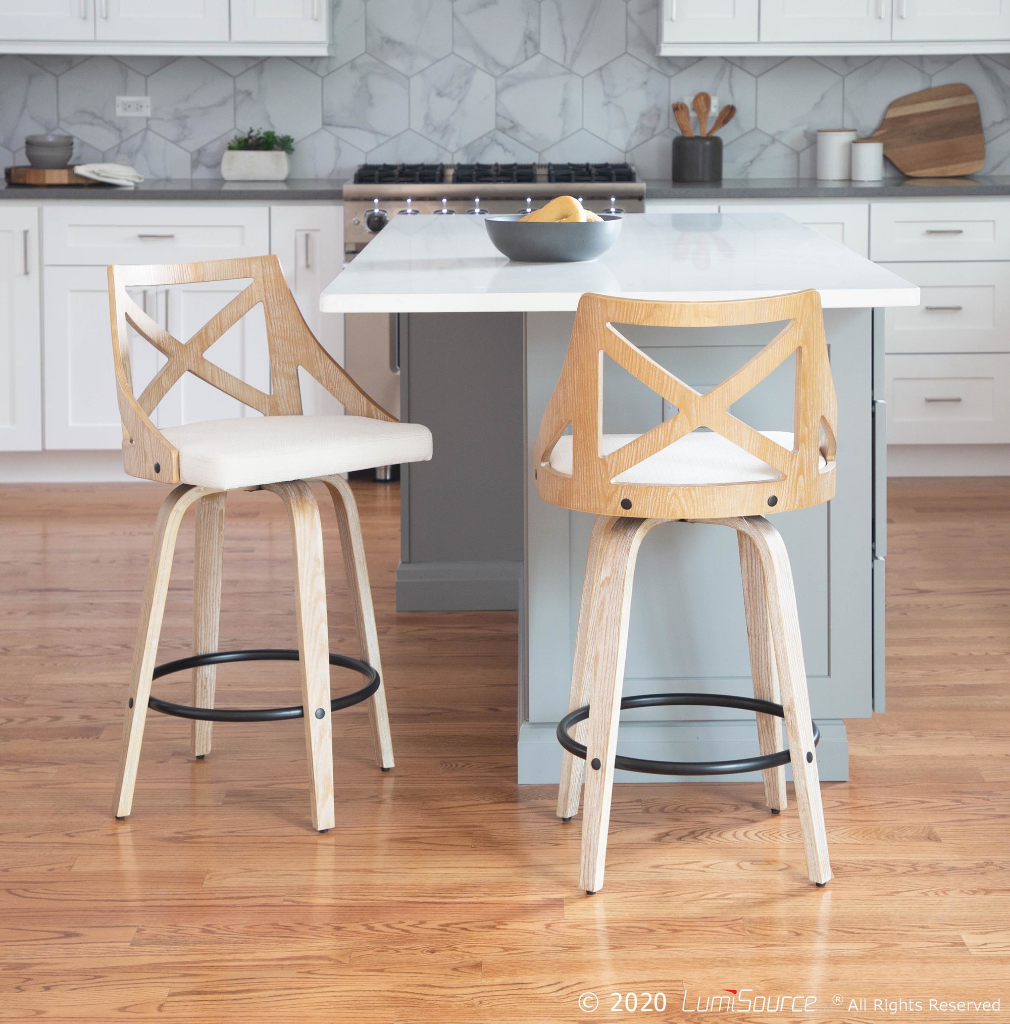 Spruce up your dining area with the Charlotte Counter Stool by LumiSource. With elegant styling, the backrest shows off an X-shaped accent. Featuring white washed wood, fabric upholstery, and a swivel seat, the Charlotte Counter Stool beautifully straddles the line between traditional and farmhouse styles.
