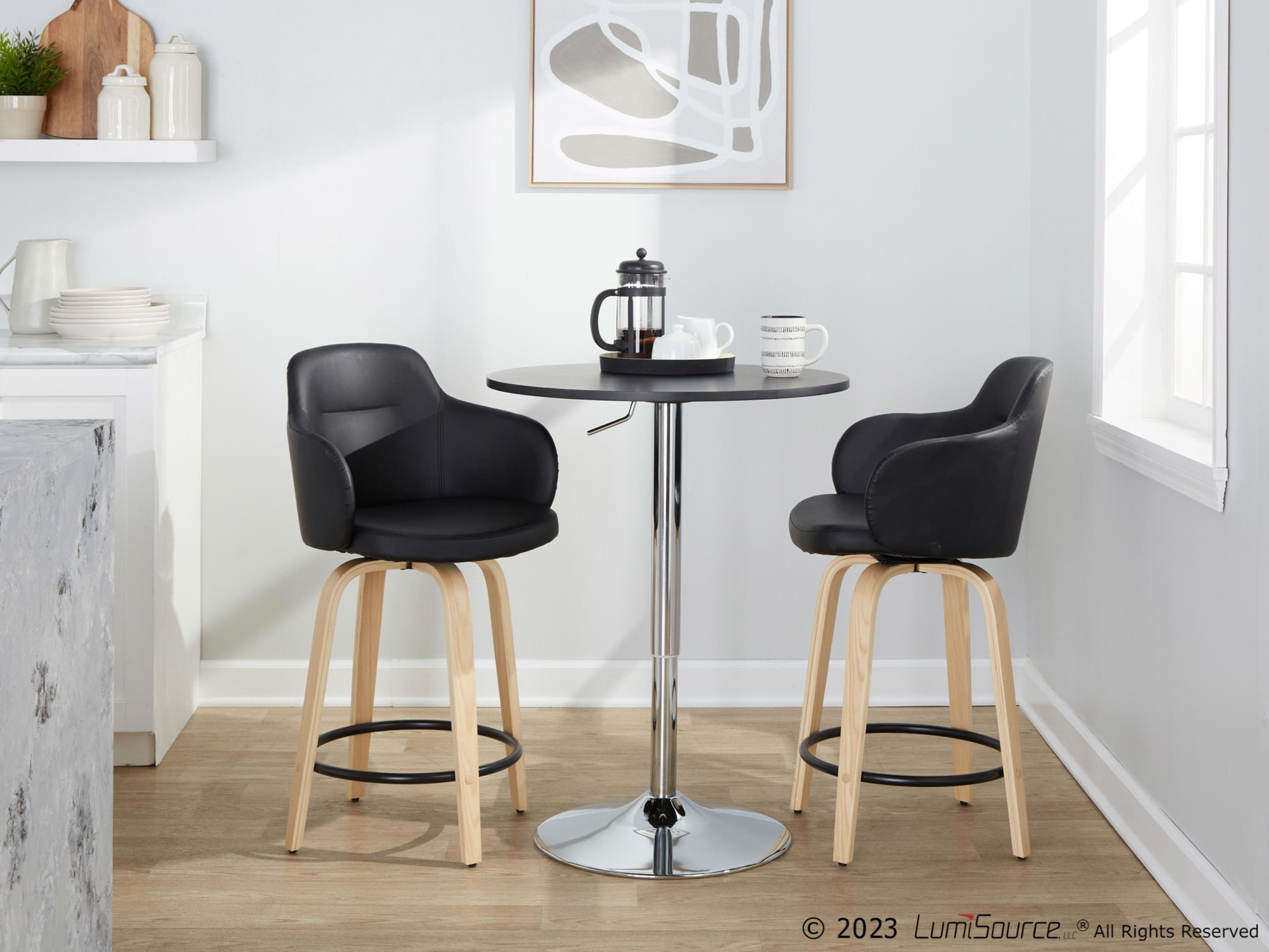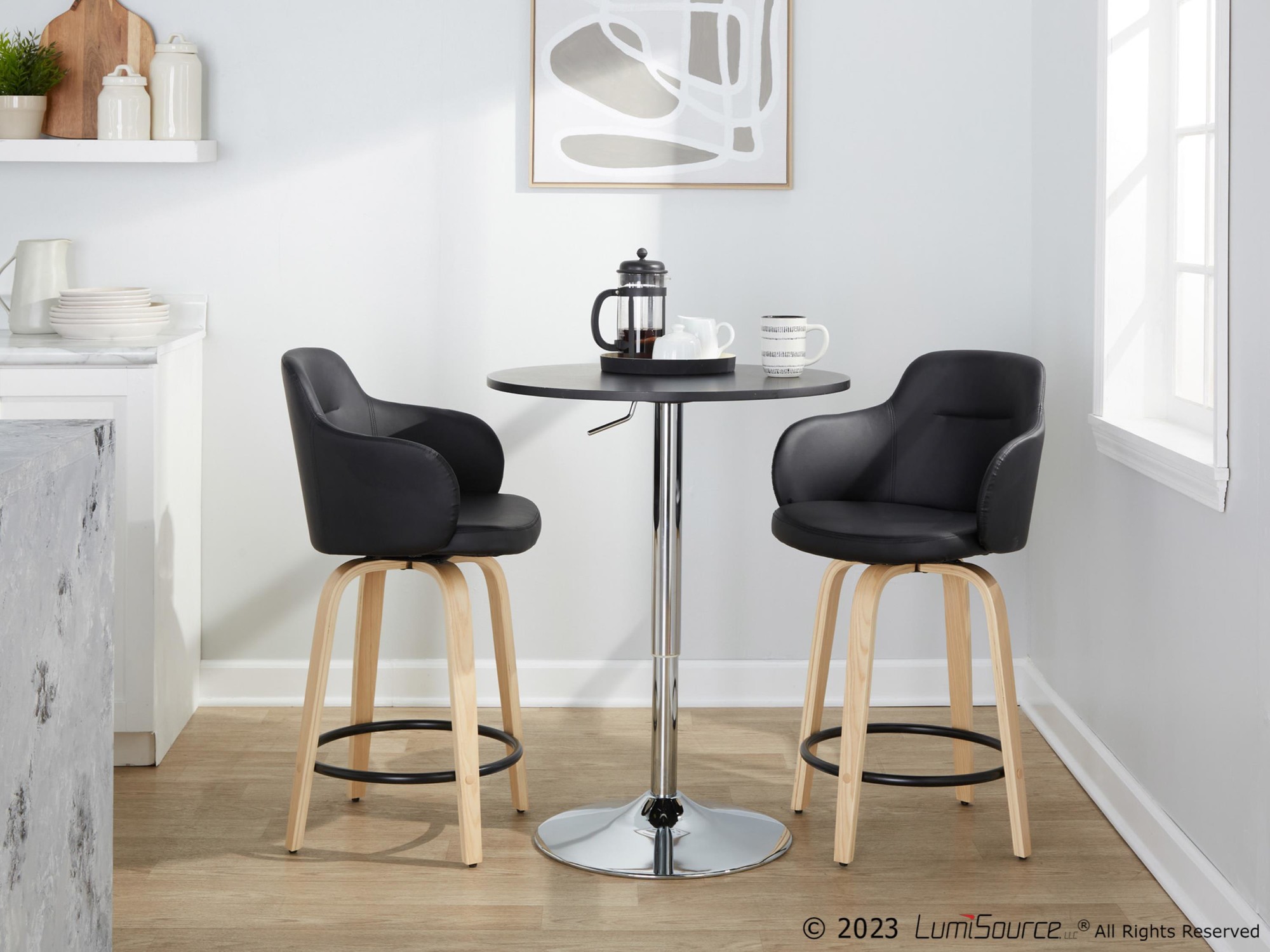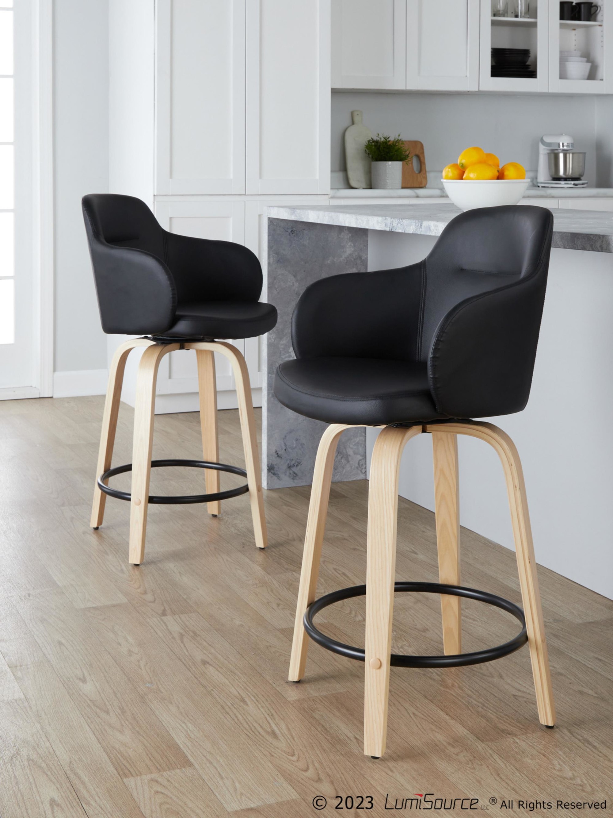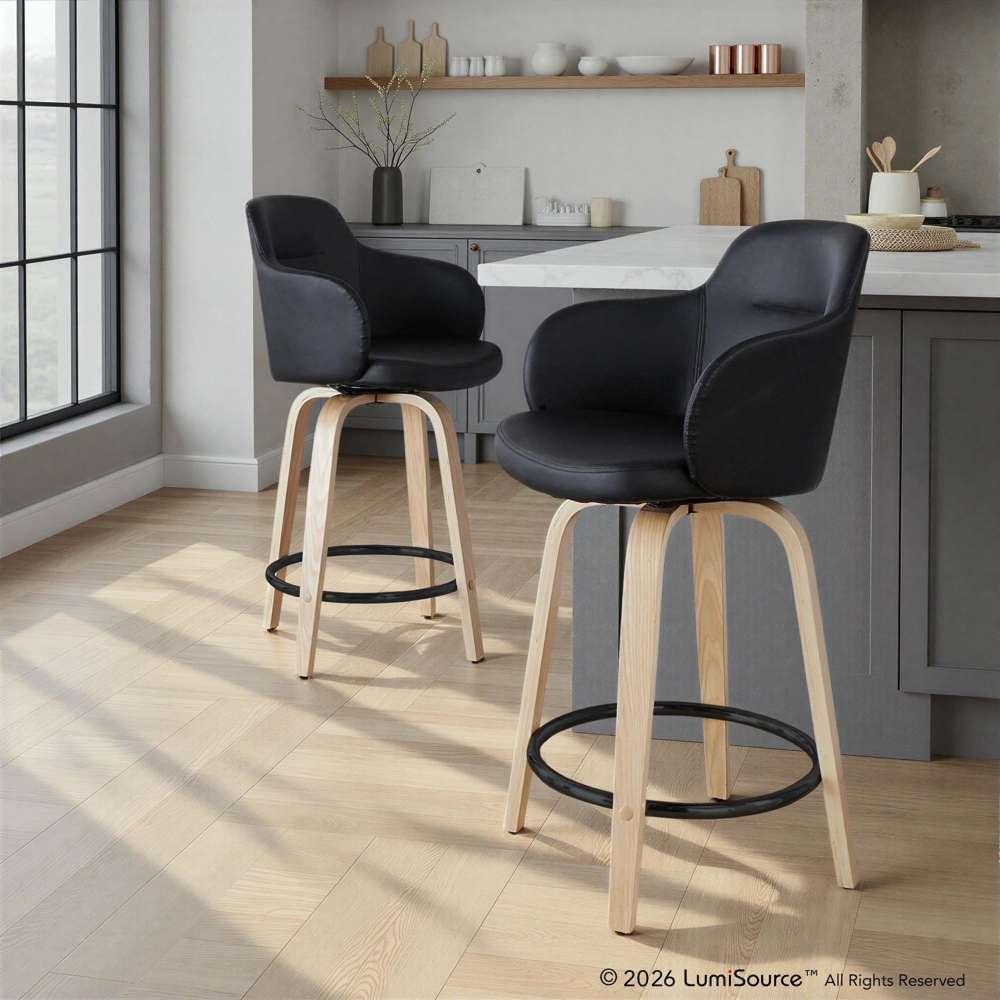 The contemporary charm of the Boyne Fixed-Height Counter Stool by LumiSource combines comfort with stylish appeal. An upholstered bucket-style seat sits on a fixed-height wood base with a round built-in footrest. Available in a variety of colors and sold in a set of two.