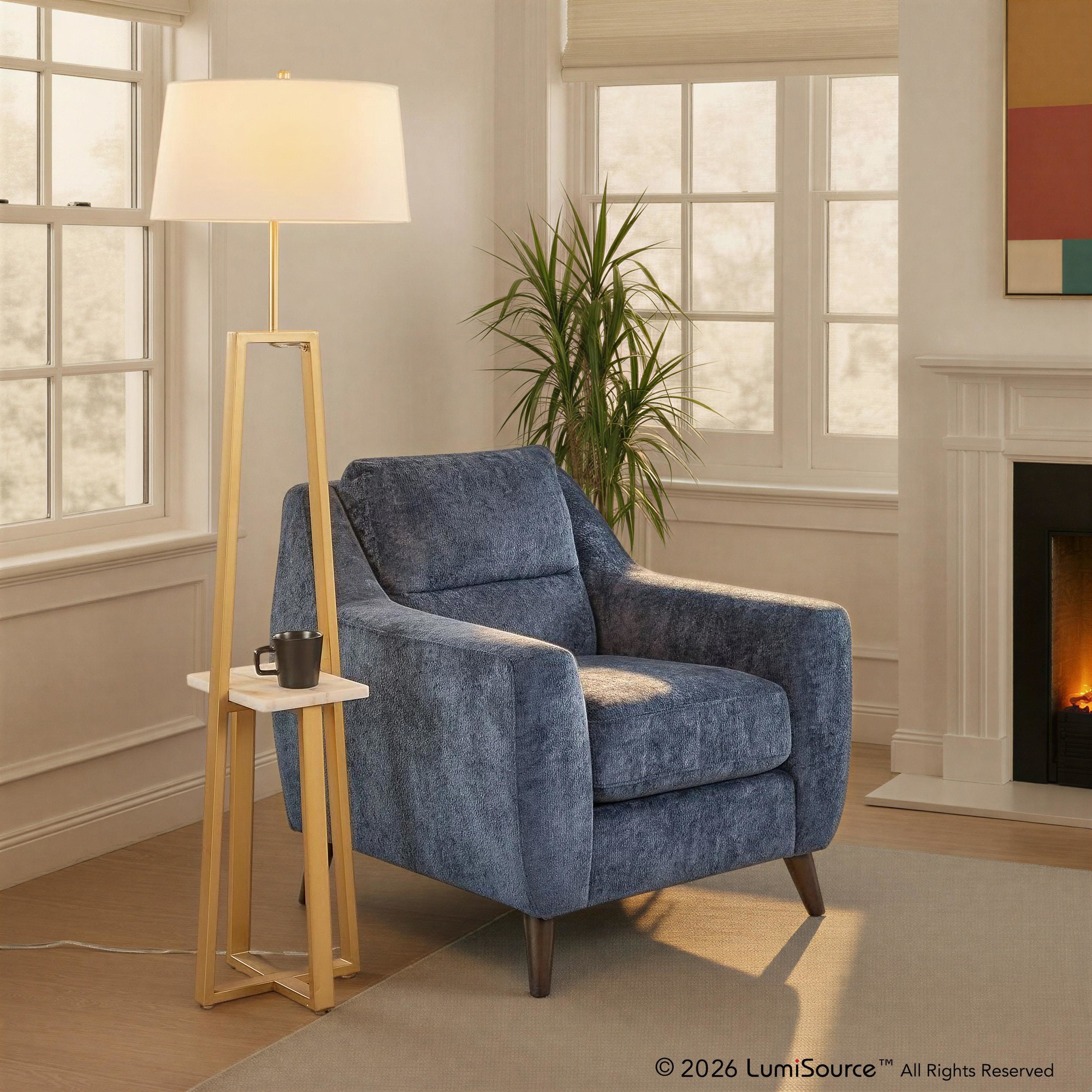 Full of modern elegance, the Cosmo Shelf Floor Lamp by LumiSource will elevate your room in effortless style. Featuring a stunning geometrical metal base, a sleek marble shelf, and a linen shade. Perfect for any living space, office, or bedroom.