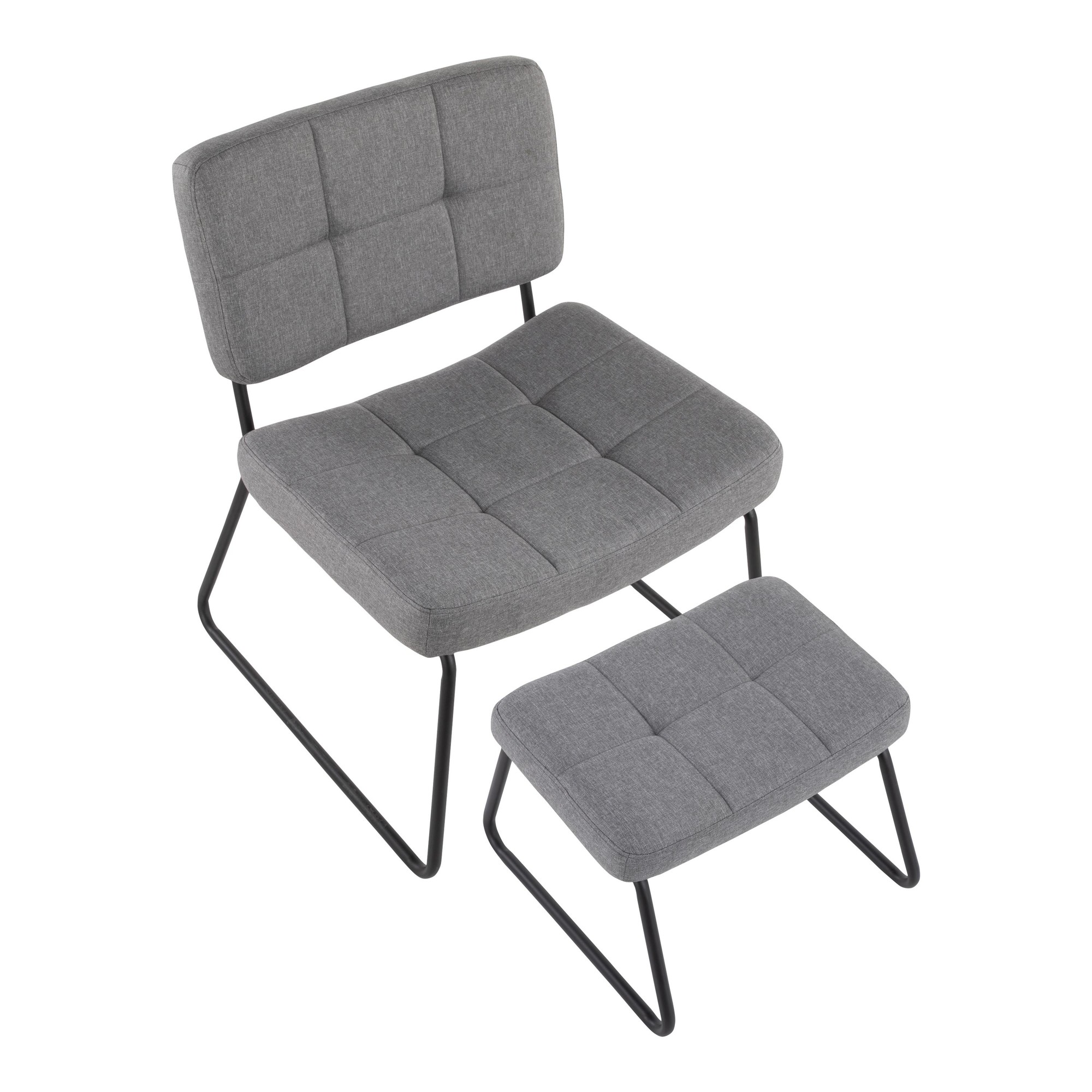 The Stout Lounge Chair and Ottoman by LumiSource were designed with comfort in mind. The Stout is supported by a stylish black metal base and features sleek fabric upholstery, tufting, a padded seat, backrest, and ottoman. Get comfy and look great doing it!